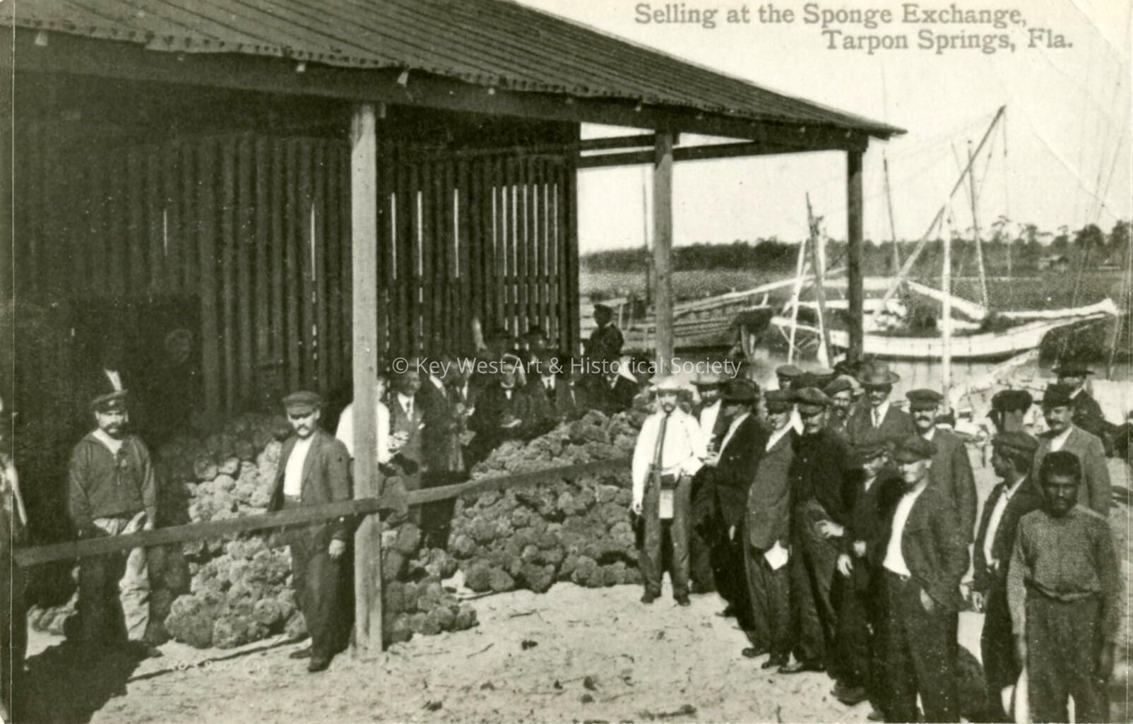 Postcard depicting the sponge market in Tarpon Springs. The caption reads, 'Selling at the Sponge Exchange, Tarpon Springs, Fla.'Subject Place