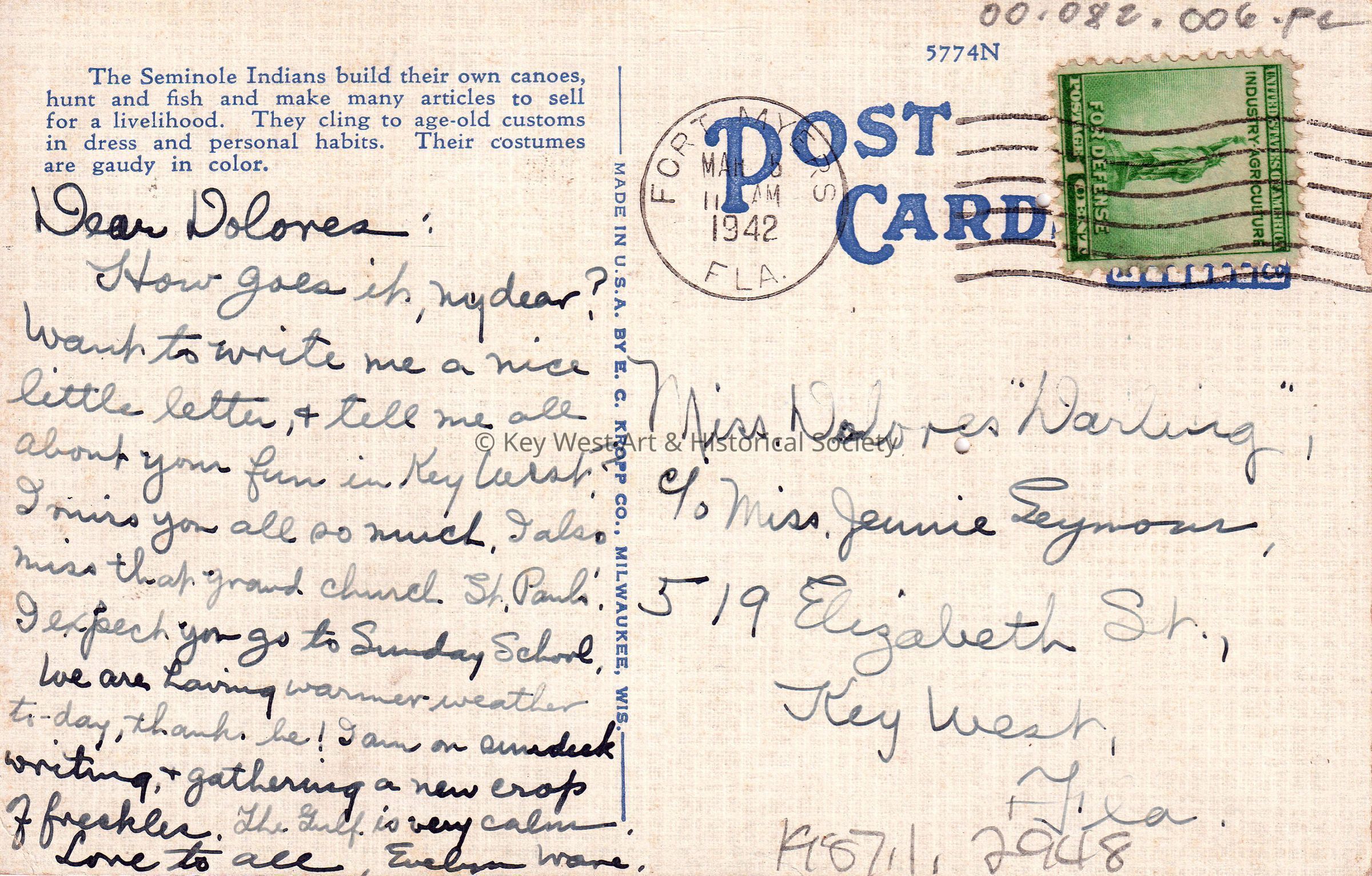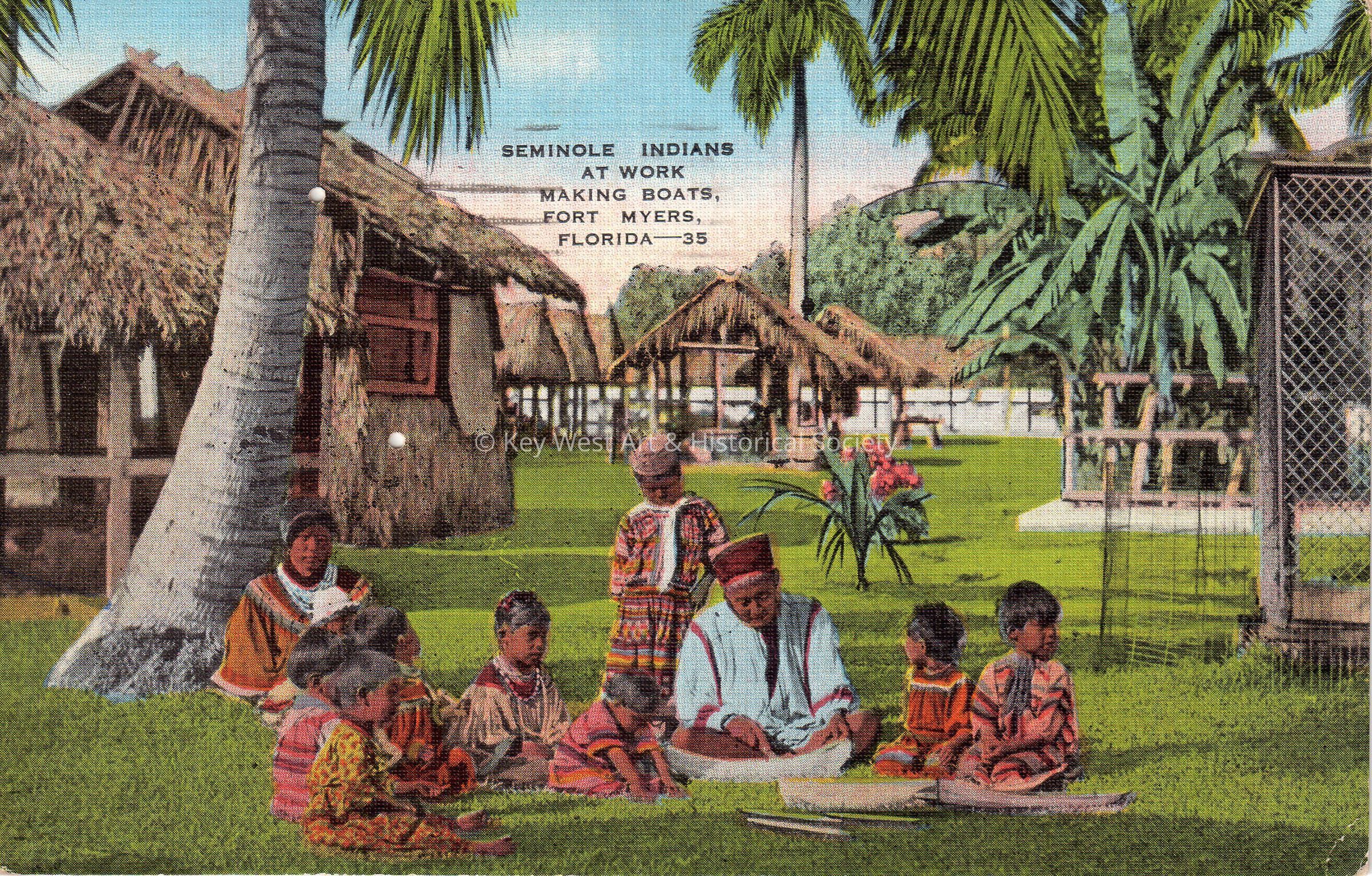 Postcard depicting a group of native Americans near thatched huts. The caption reads, ‘Seminole Indians at work making boats, Fort Myers, Florida’. The description on the verso reads, ‘The Seminole Indians build their own canoes, hunt and fish and make many articles to sell for a livelihood. They cling to age-old customs in dress and personal habits. Their costumes are gaudy in color.’ The message on the verso reads, ‘Dear Dolores, How goes it, my dear? Want to write me a nice little letter, and tell me all about your fun in Key West? I miss you all so much. I also miss that grand church, St. Paul’s. I expect you go to Sunday School. We are having warmer weather today, thanks be! I am on our deck writing and gathering a new crop of freckles. The Gulf is very calm. Love to all, Evelyn Ware.’ The card is addressed to Miss Dolores “Darling”, c/o Miss Jennie Seymour, 519 Elizabeth Street, Key West, Florida, and is postmarked Fort Myers, Florida, March 5, 1942.Collection