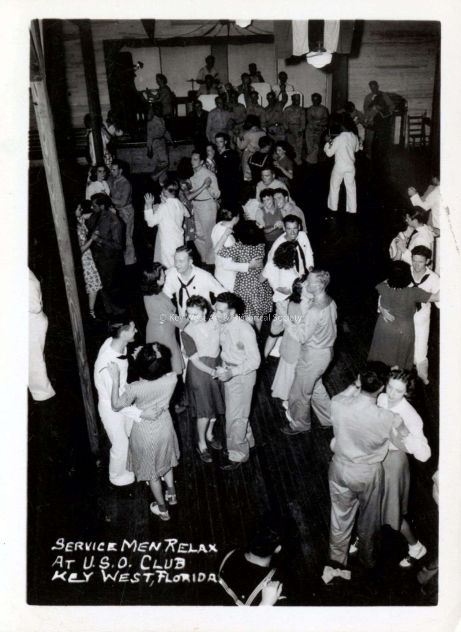 Black and white photograph of US Navy personnel dancing at the USO Club located at 530 Whitehead Street. The sailors and local Key West women are dancing to a band in the background.