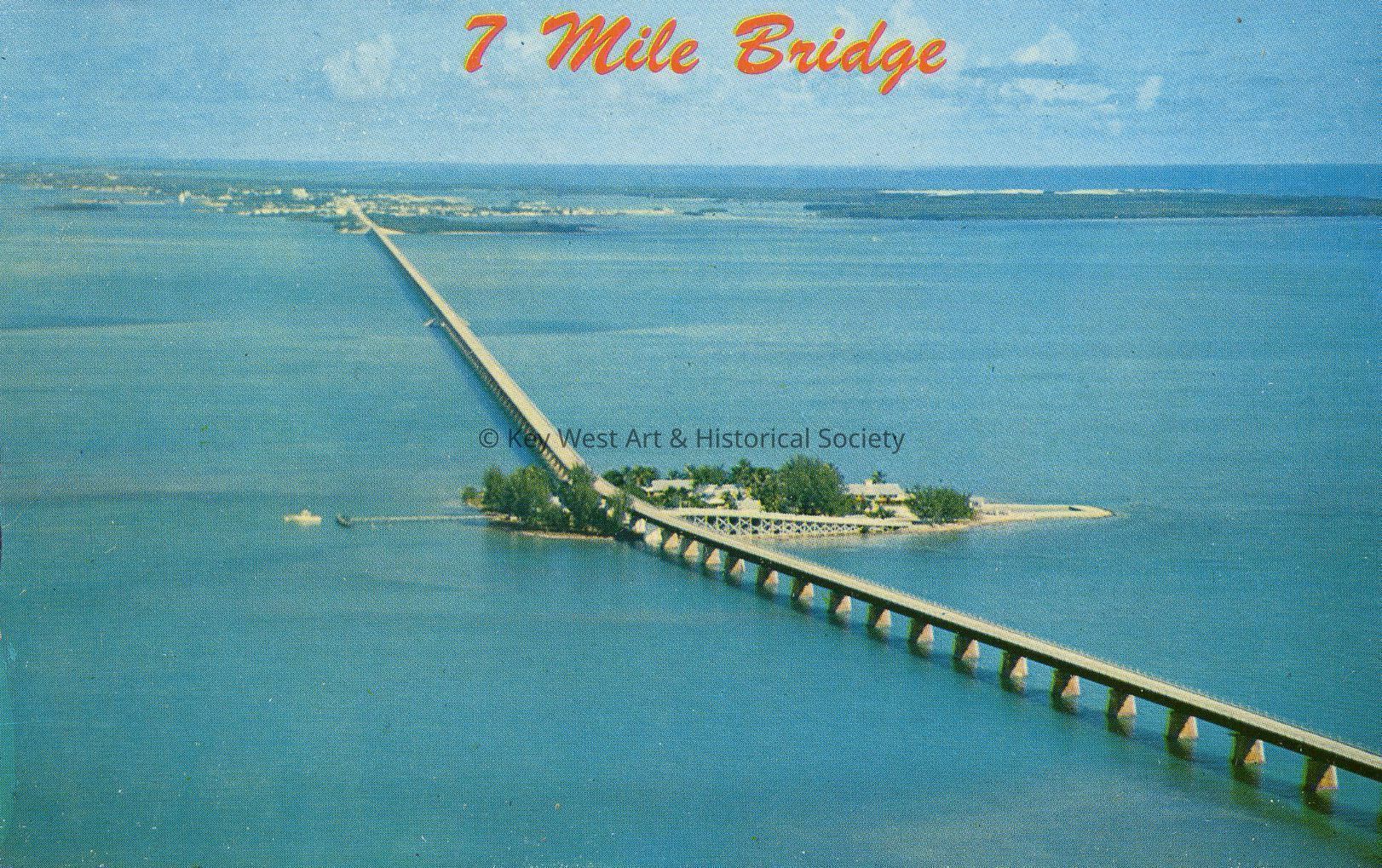 Postcard depicting an aerial view of the Seven Mile Bridge over Pigeon Key. The caption reads, ‘Seven Mile Bridge’. Notation on verso, 'Air view of Pidgeon [sic] Key and the Seven Mile Bridge, on the famous Overseas Highway, Florida. Marathon in the background.'Subject Place