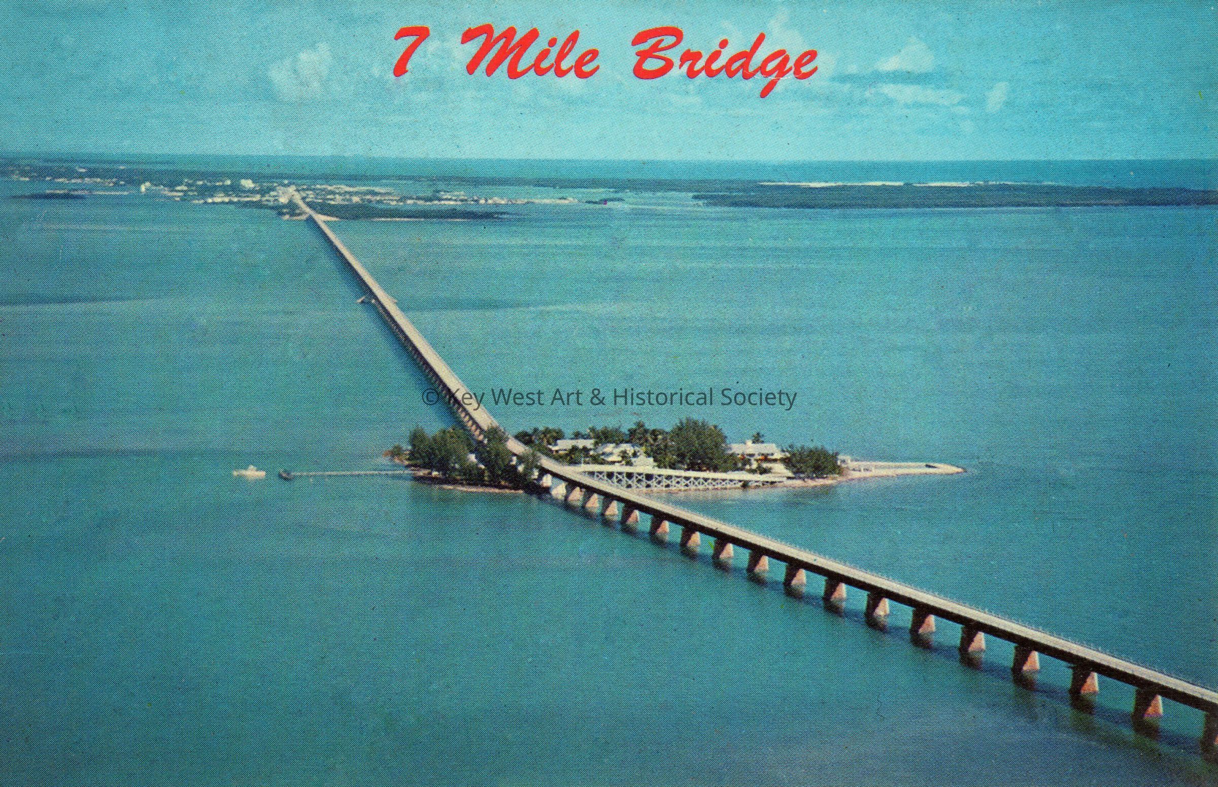 Postcard depicting an aerial view the Seven Mile Bridge over Pigeon Key. The caption reads, ‘Seven Mile Bridge’. Notation on verso, 'Air view of Pidgeon [sic] Key and the Seven Mile Bridge, on the famous Overseas Highway, Florida. Marathon in the background.'Subject Place