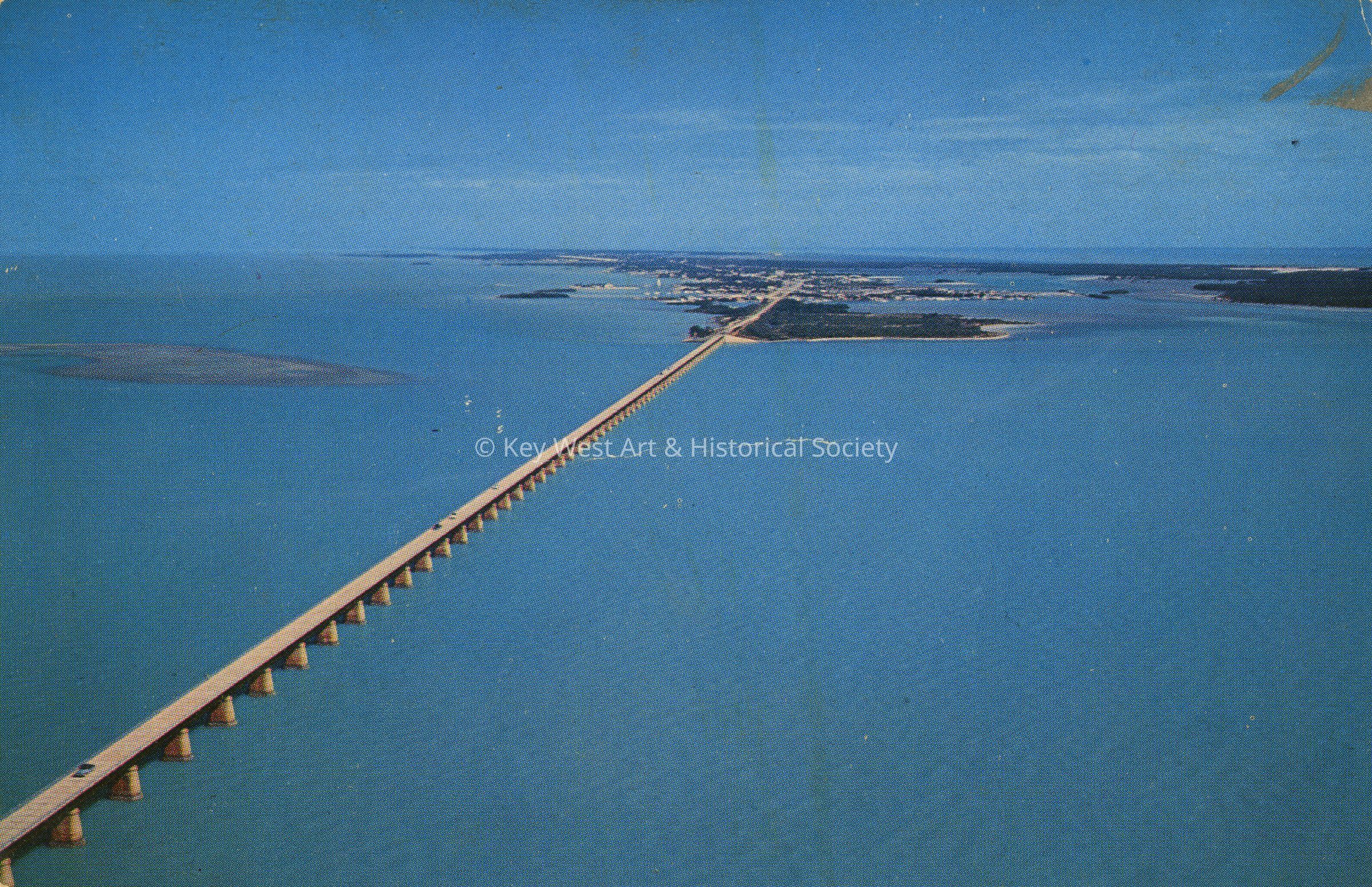 Postcard view of the Seven Mile Bridge. Notation on verso, 'Seven Mile Bridge looking North showing Marathon in the distance on the Famous Overseas Highway, Florida.'Subject Place