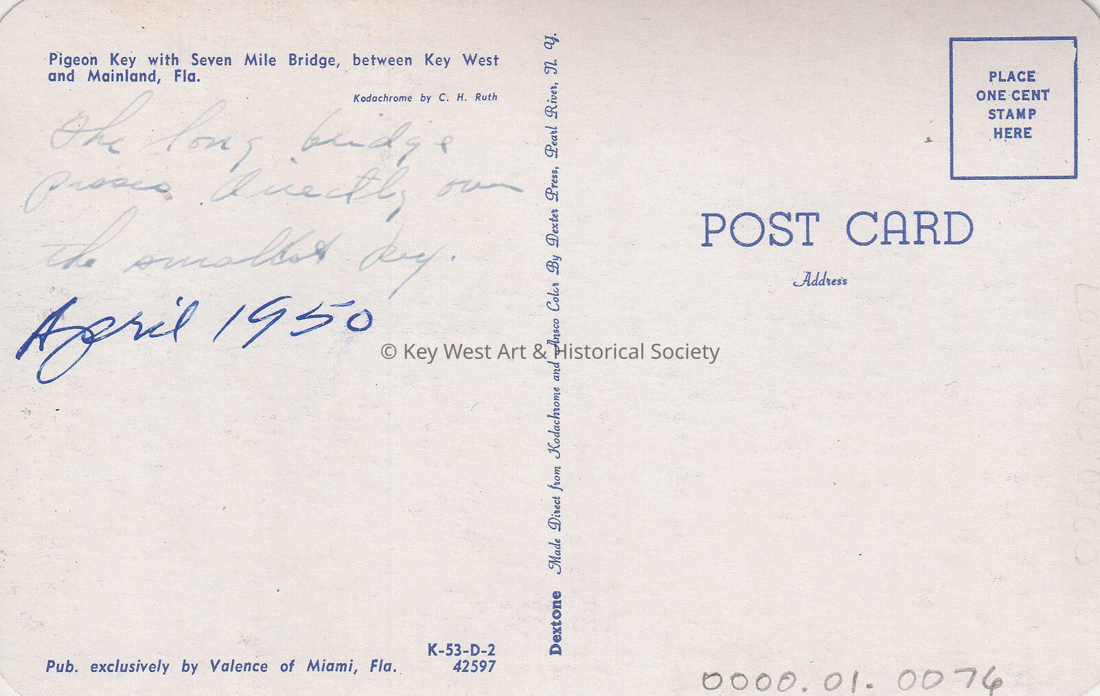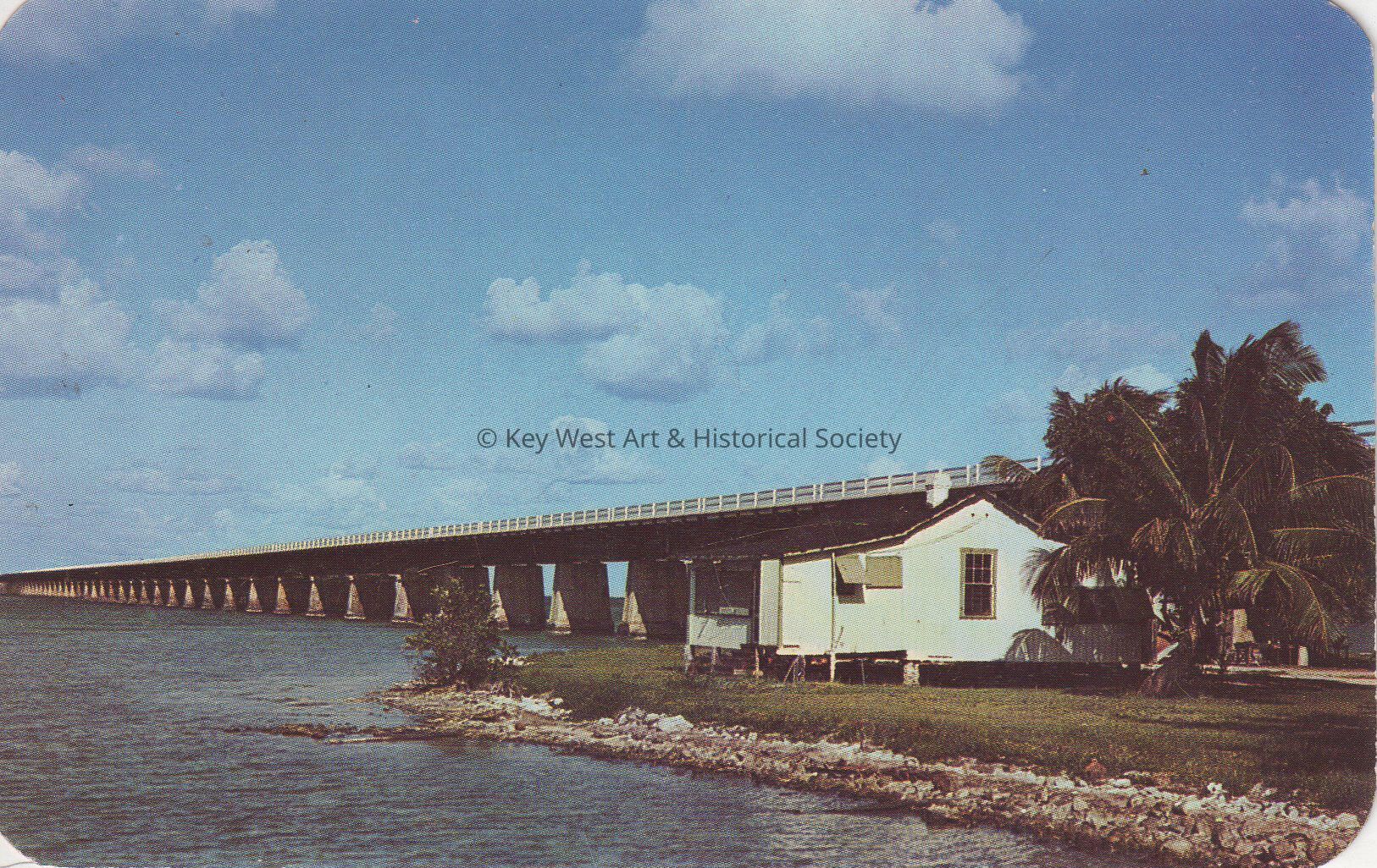 Postcard depicting the Seven Mile Bridge over Pigeon Key. The description on the verso reads, 'Pigeon Key with Seven Mile Bridge, between Key West and Mainland, Fla.'Subject Place