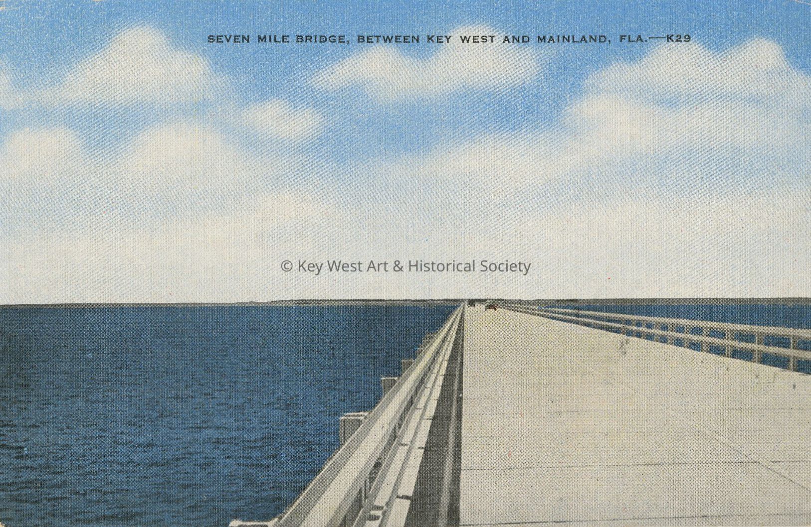 Postcard of Seven Mile Bridge, between Key West and mainland Fla. The beautiful Overseas Highway from the mainland to Key West is 130 miles of concrete and steel; 11 bridges in and 41 miles sections; the length of the Seven Mile Bridge being 35,500 ft. This is one of the longest bridges of its type in the world.Collection