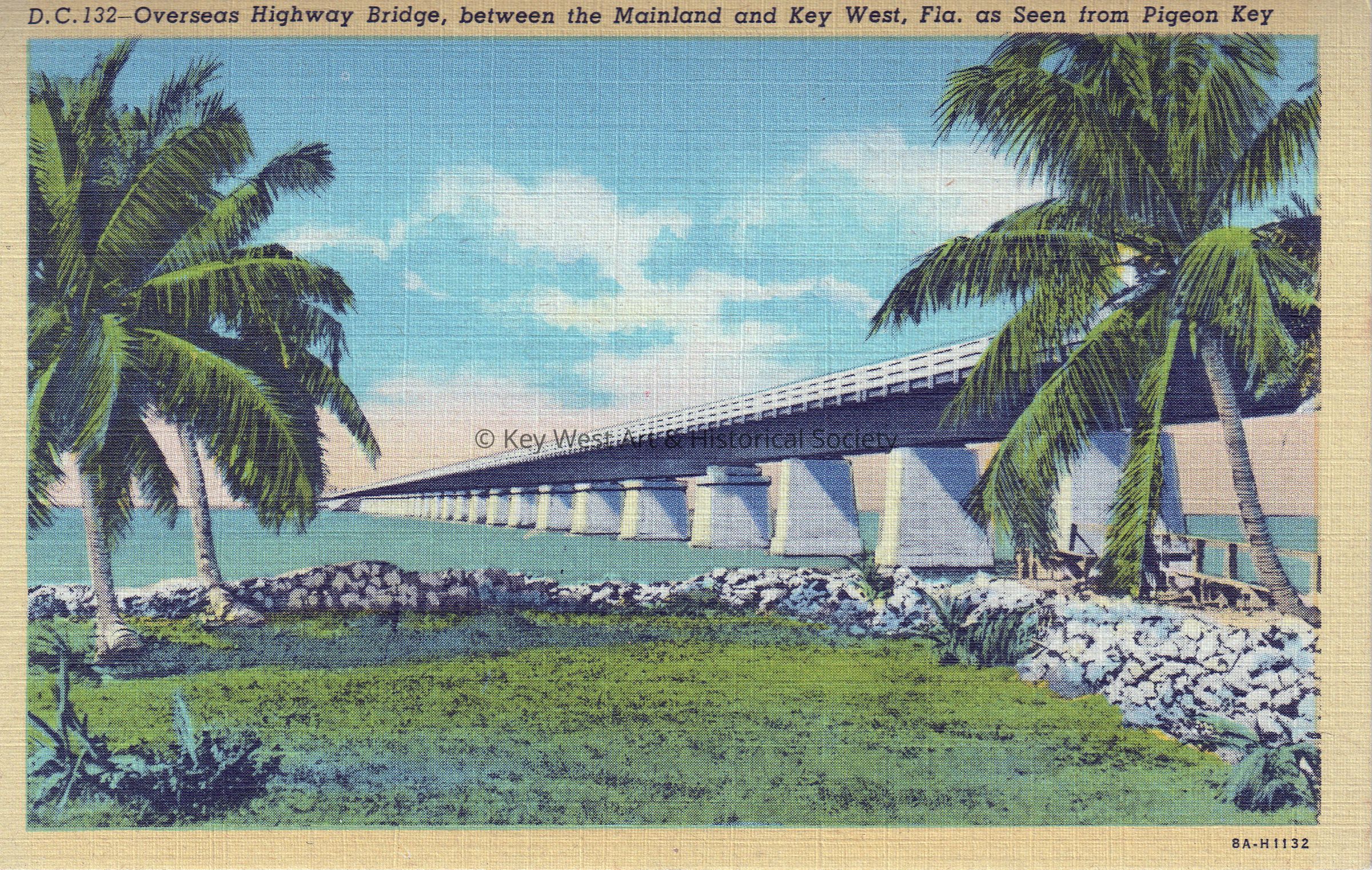Postcard depicting a highway built over the water. The caption reads, ‘Overseas Highway Bridge, between the Mainland and Key West, Florida, as seen from Pigeon Key.’Collection