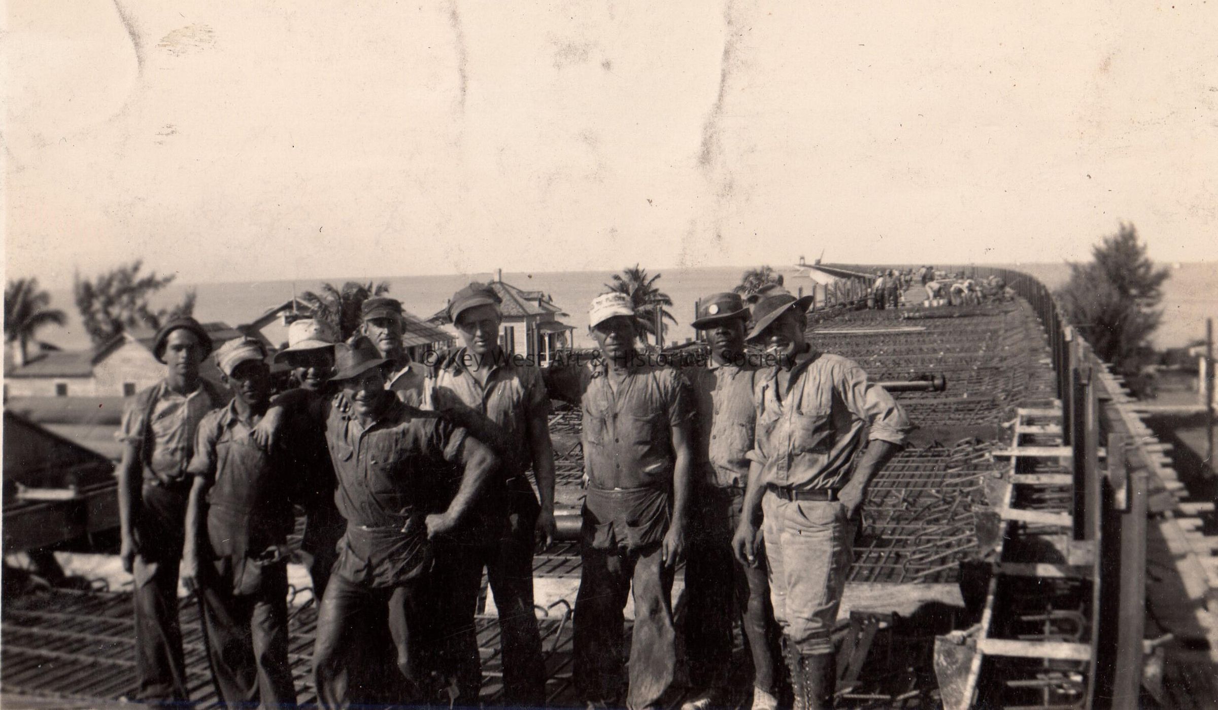 Black and white photograph of a group of construction workers standing on the original Seven Mile Bridge during the renovation from railroad bridge to highway bridge. Pigeon Key is visible beneath the bridge.