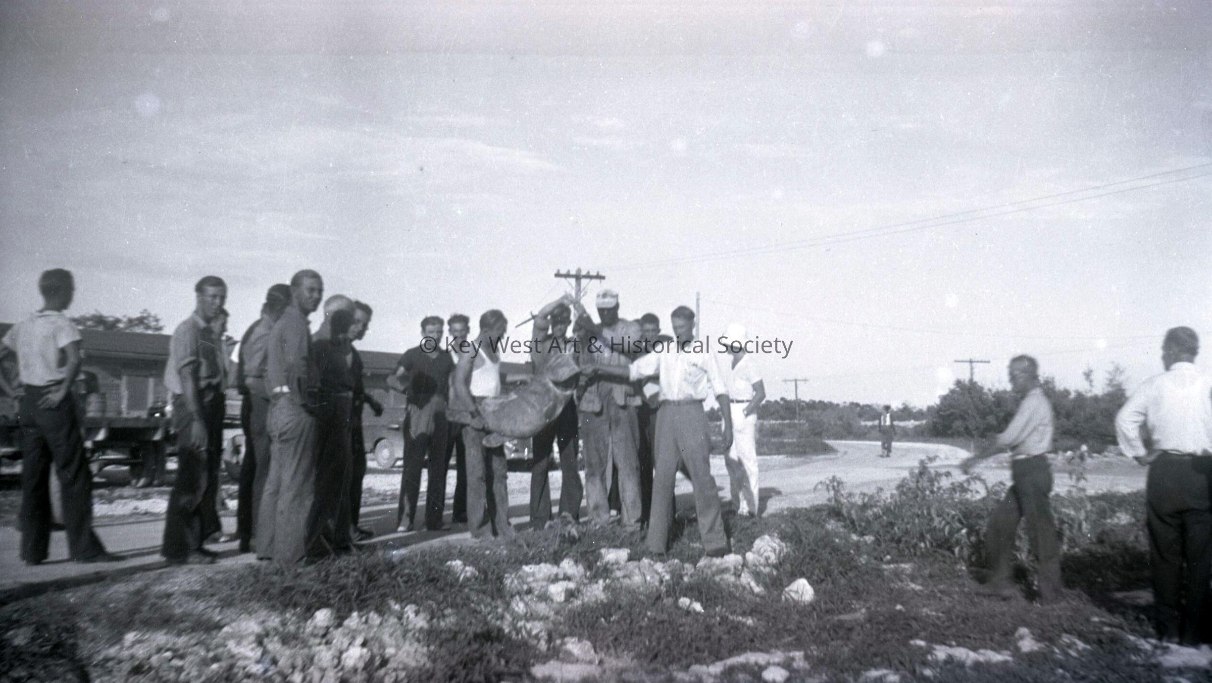Black and white negative of a group of Seven Mile Bridge Overseas Highway construction workers holding a Goliath grouper.