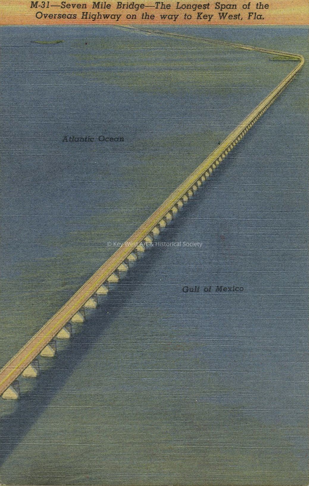 Postcard of Seven Mile Bridge, the longest span of the Overseas Highway on the way to Key West. Fla. Also depicting the Atlantic Ocean and Gulf of Mexico. In 1937 the Overseas Road and Bridge Commission acquired 40 miles of abandoned railroad viaducts and roadbed. These have been converted into highway bridges and a magnificent roadway which stretches for miles over the open sea to Key West, the southernmost city in the U.S.Collection