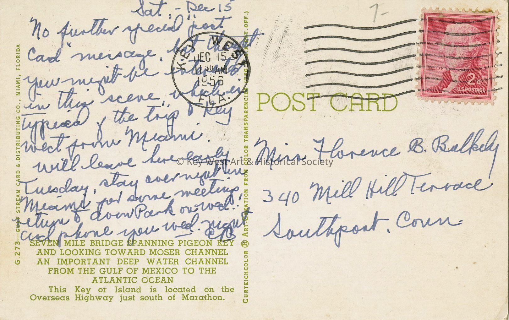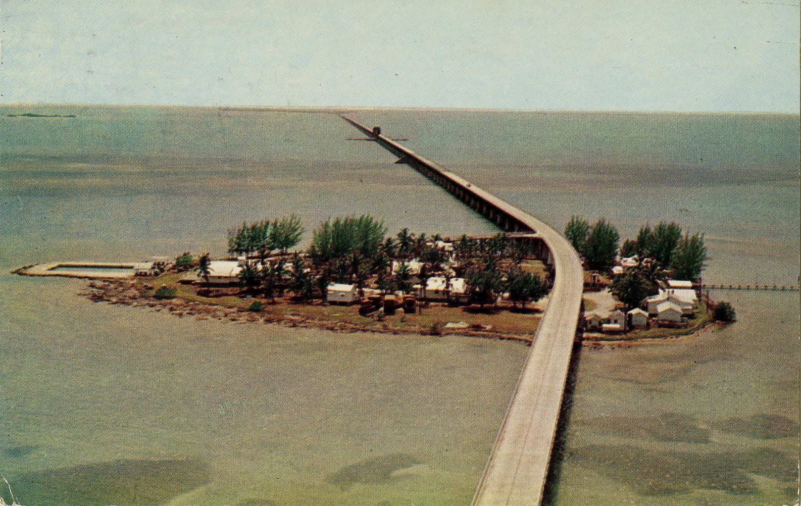 Postcard depicting Seven Mile Bridge spanning Pigeon Key and looking toward Moser Channel. An important deep water channel from the Gulf of Mexico to the Atlantic Ocean. This Key or island is located on the Overseas Highway just south of Marathon.Collection