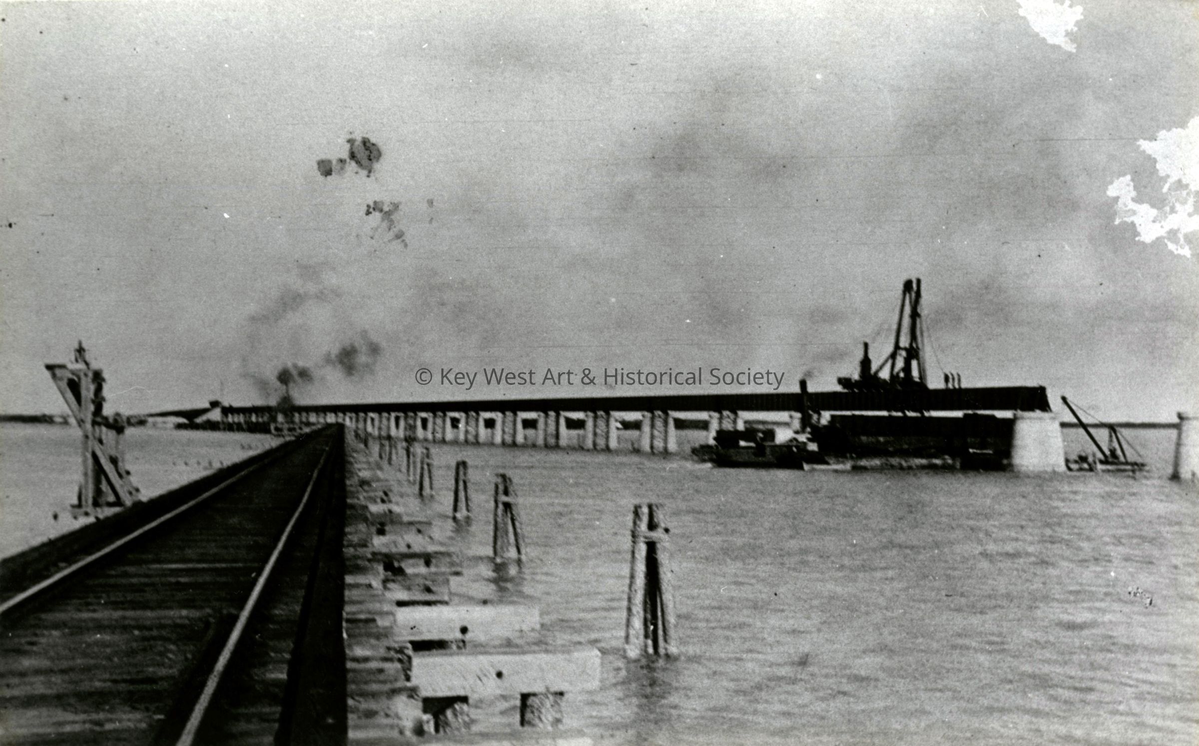 Black and white photograph of Florida East Coast Railway construction workers setting tracks for the Seven Mile Bridge.
