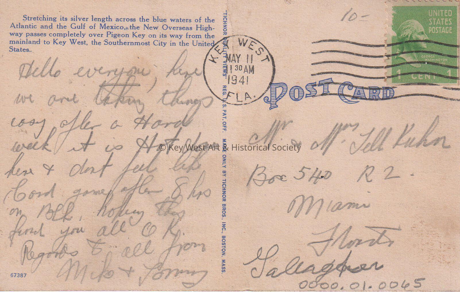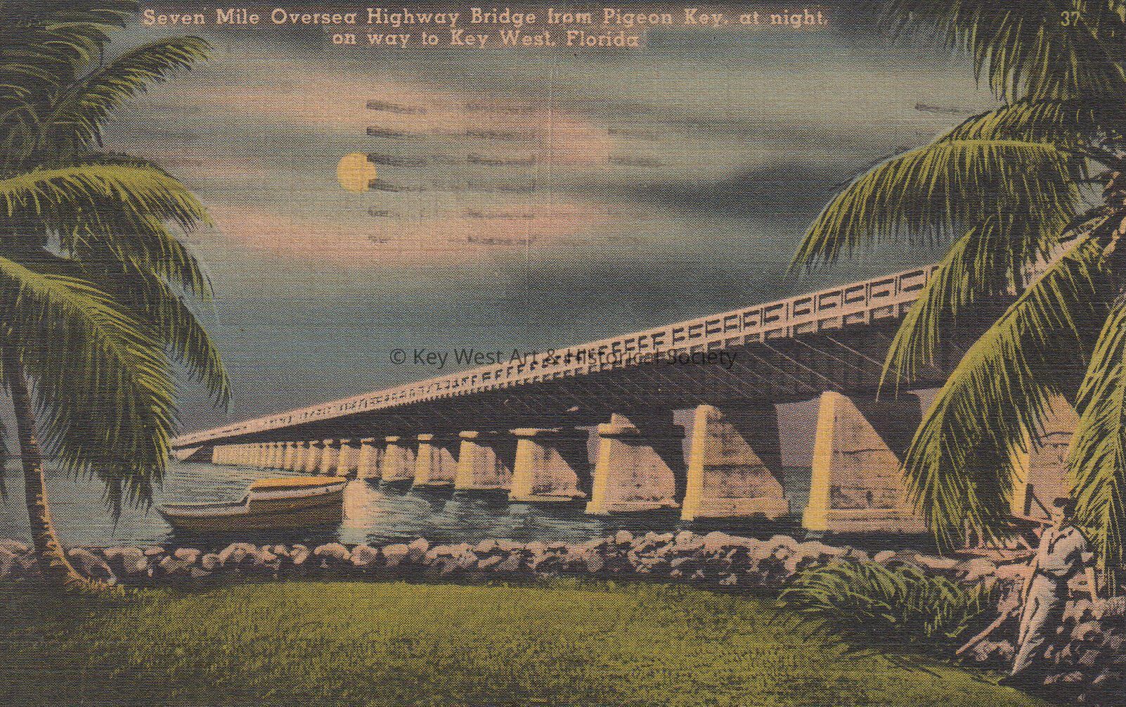 Postcard depicting the Seven Mile Bridge over Pigeon Key at night. The caption reads, ‘Seven Mile Oversea Highway Bridge from Pigeon Key, at night, on way to Key West, Florida.’ The description on the verso reads, ‘Stretching its silver-length across the blue waters of the Atlantic and the Gulf of Mexico, the new Overseas Highway passes completely over Pigeon Key on its way from the mainland to Key West, the Southernmost City in the United States.’Subject Place