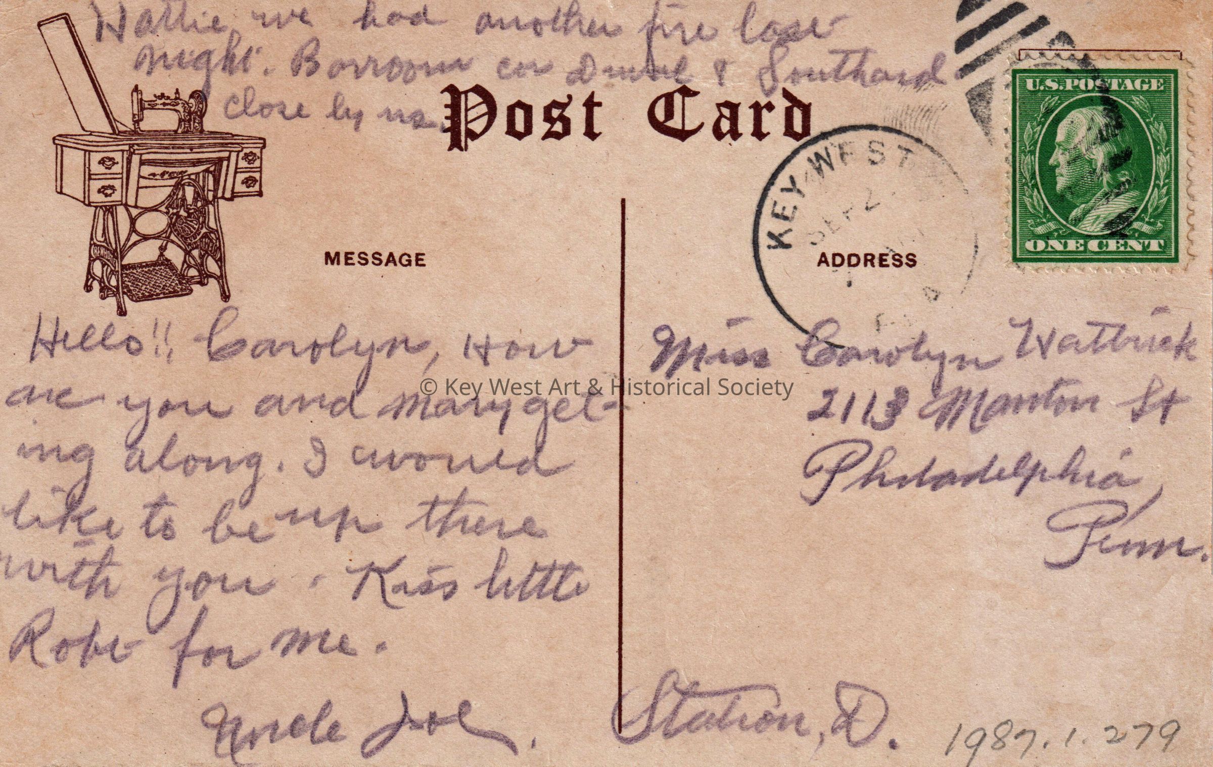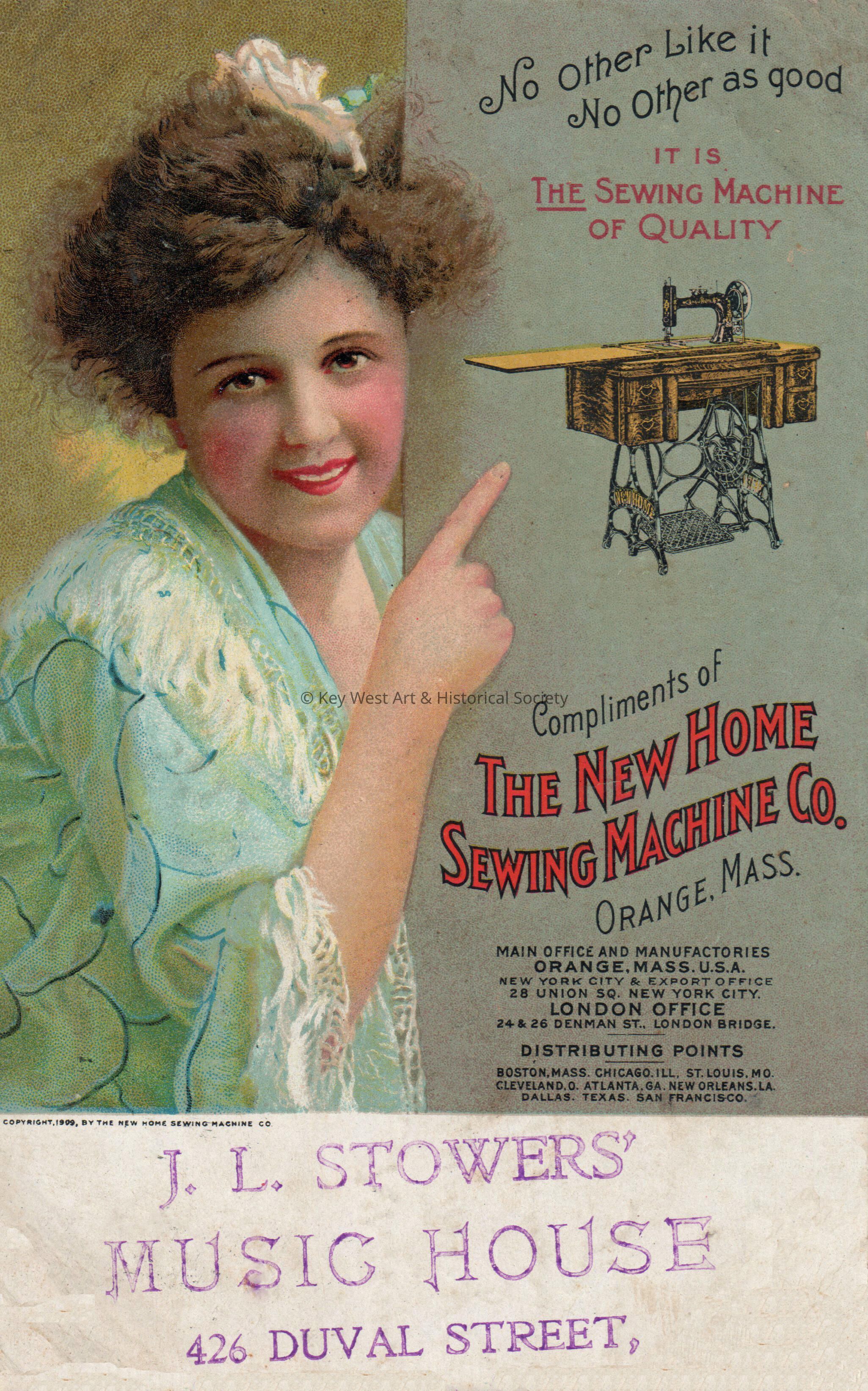 Postcard depicting a woman pointing to an advertisement for a sewing machine. The advertisement reads, ‘No other like it, no other as good, it is the sewing machine of quality. Compliments of the New Home Sewing Machine Company, Orange, Massachusetts. Main office and manufactories Orange, Massachusetts, U.S.A., New York City and export office, 28 Union Square, New York City. London office, 24-26 Denman Street, London Bridge. Distributing points - Boston, Massachusetts, Chicago, Illinois, St. Louis, Missouri, Cleveland, Ohio, Atlanta, Georgia, New Orleans, Louisiana, Dallas, Texas, and San Francisco.’ The caption reads, ’J. L. Stowers’ Music House, 426 Duval Street’. The message on the verso reads, ‘Hello Carolyn, How are you and Mary getting along? I would like to be up there with you. Kiss little Rob for me. Uncle Joe. Hattie, We had another fire last night - barroom corner of Duval and Southard, close by us.’ The card is addressed to Miss Carolyn Hattrick 2113 Manton Street, Station D, Philadelphia, Pennsylvania, and is postmarked Key West, September.Collection