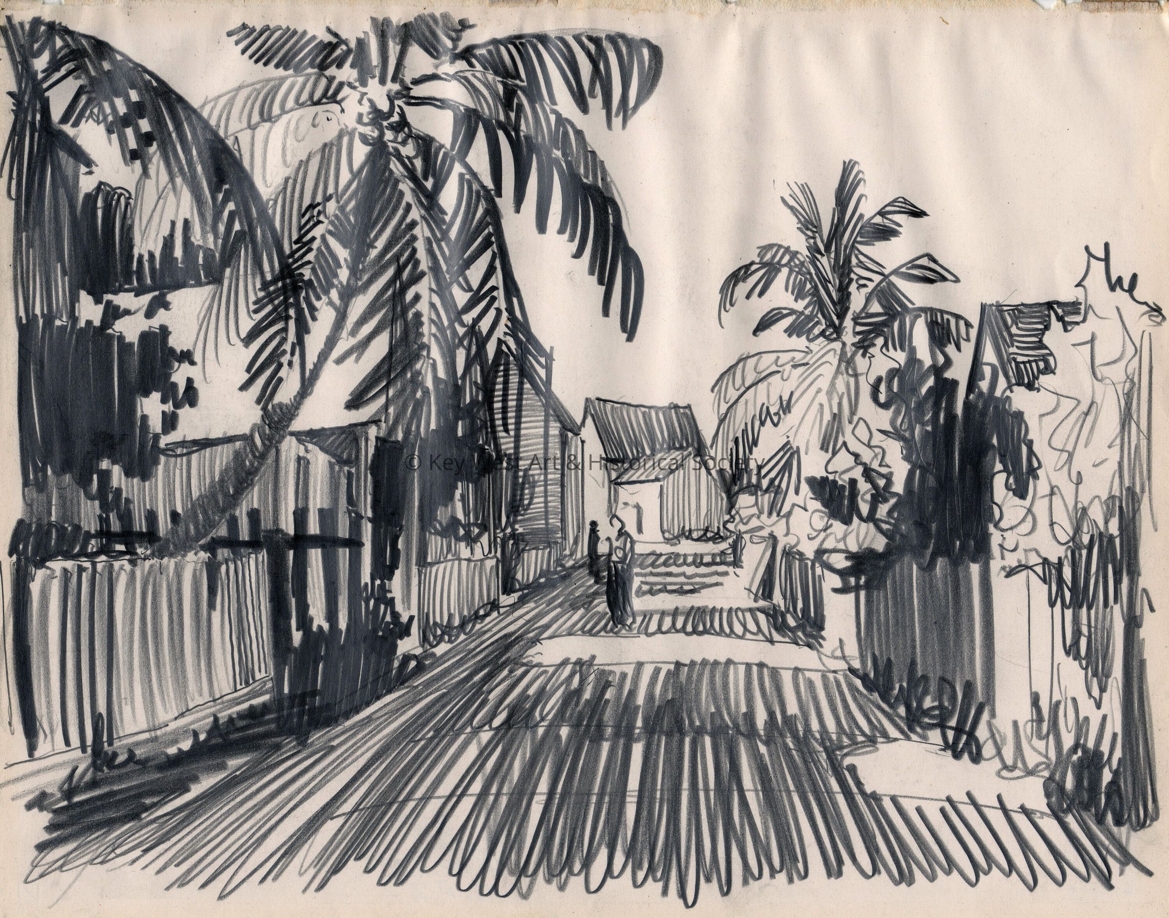 Pencil drawing on paper of a man walking down an alley. Both sides of the alley are lined with a fence and trees are growing over the fence. Houses can be seen behind the trees and further down the alley. Framed and matted.Type of Drawing