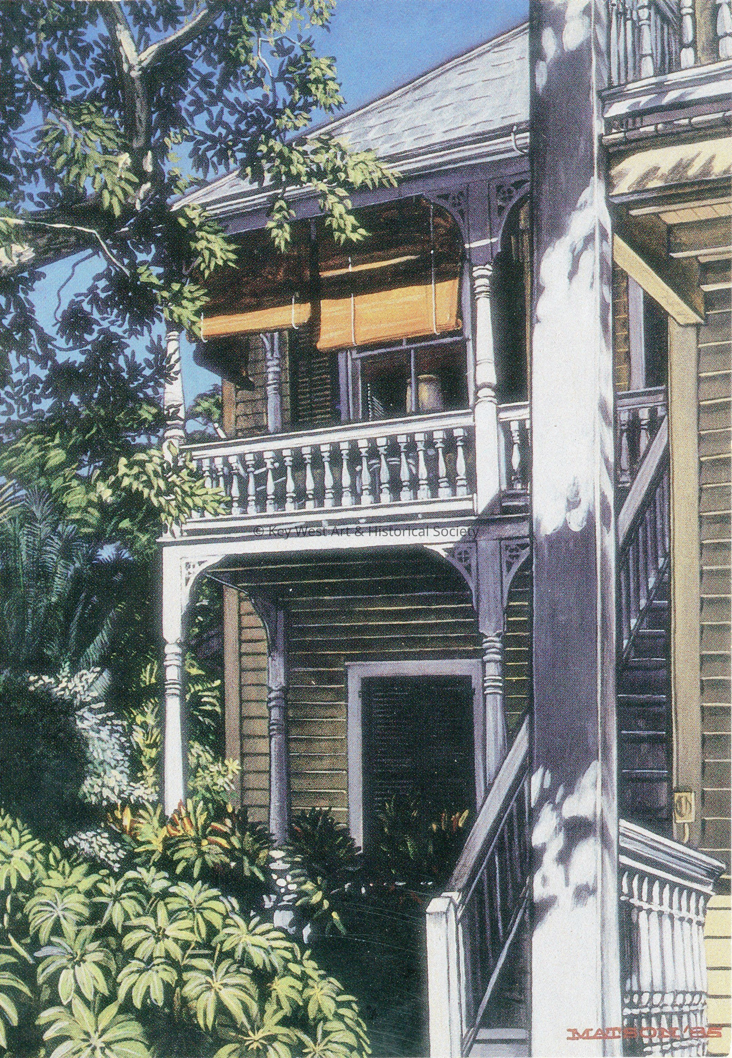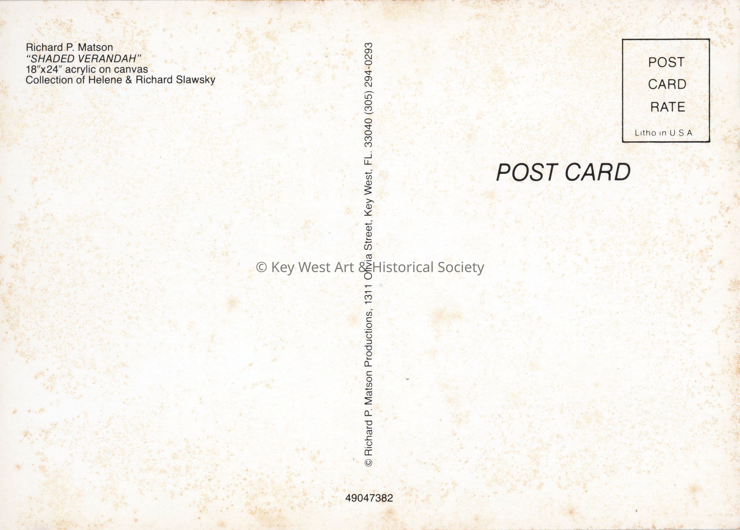 Postcard depicting a Conch House with a second story covered porch. Notation on verso reads 'Richard P. Matson. "SHADED VERANDAH" 18"x24" acrylic on canvas. Collection of Helene & Richard Slawsky.'Subject Place