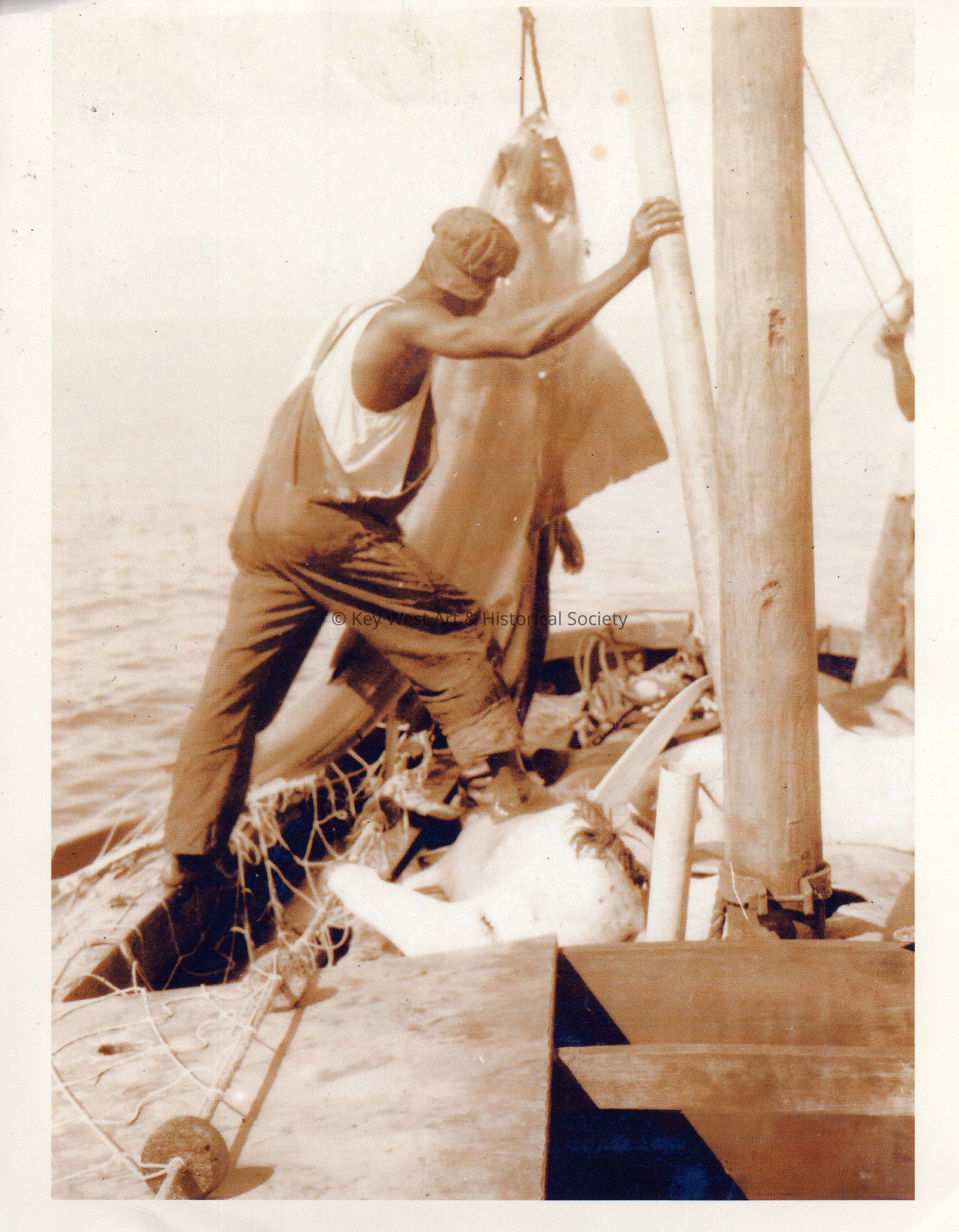 Black and white photograph of an unknown man and a shark at the Ocean Leather Processing Station in Key West Harbor.