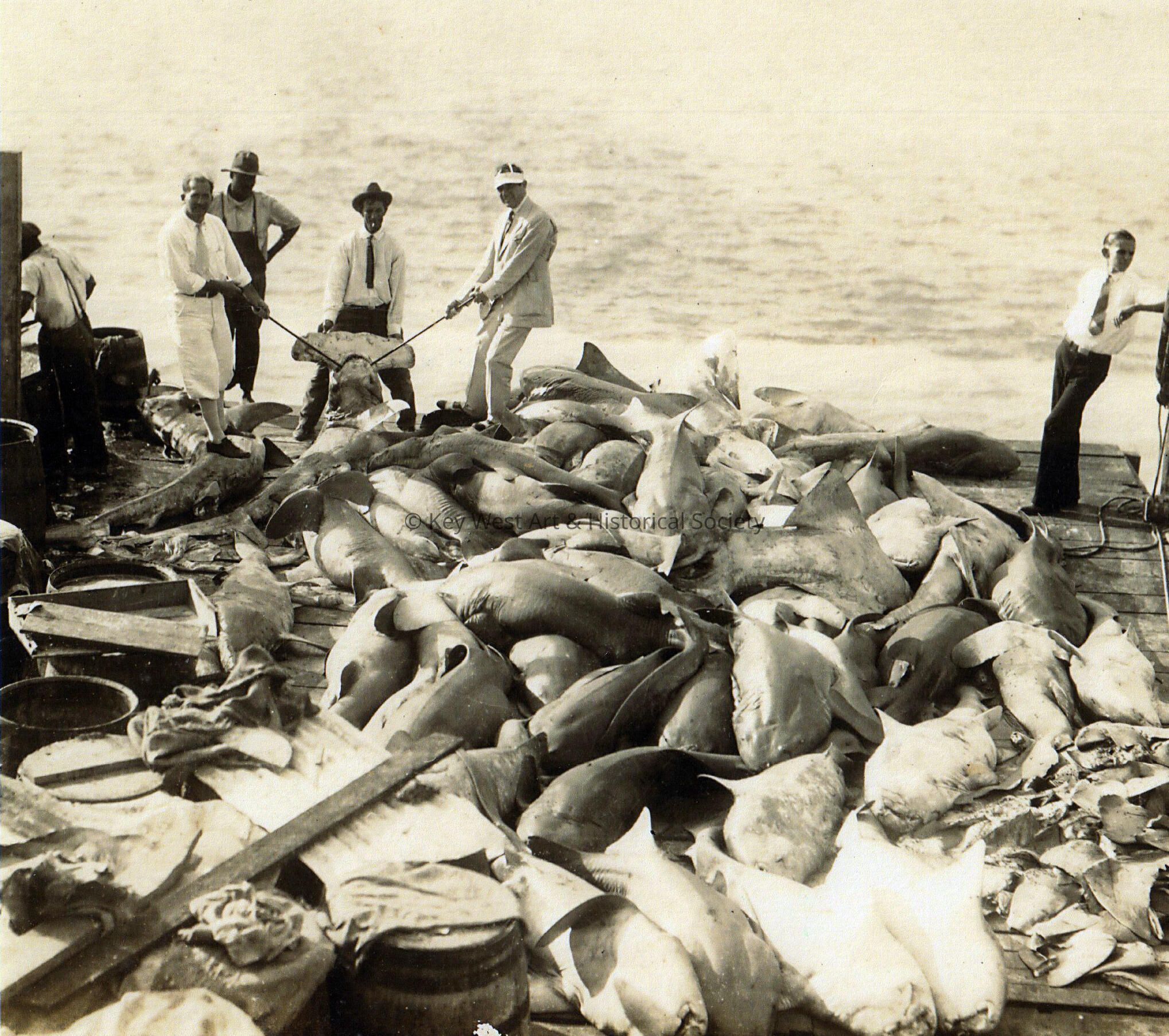 Black and white photograph of sharks at the Ocean Leather Processing Station on Wisteria Island. Image taken or collected during the 1930s by the WPA workers in Key West.