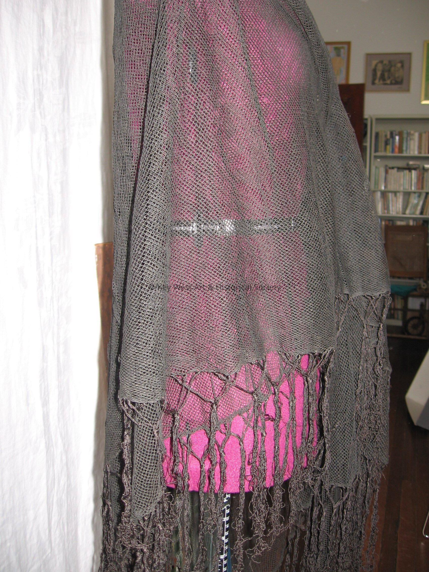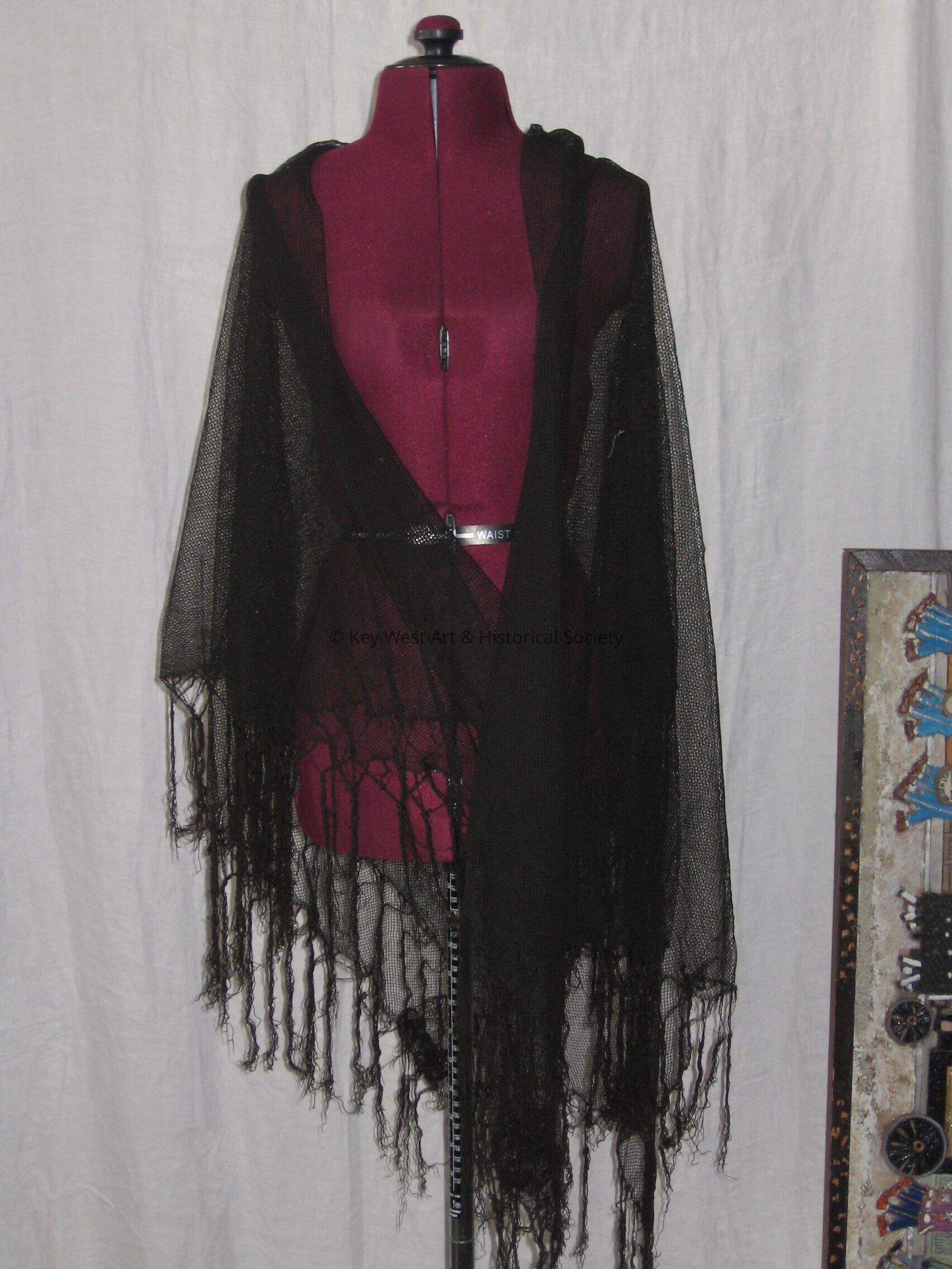 Black net shawl or mantilla with tassels lining the hem.