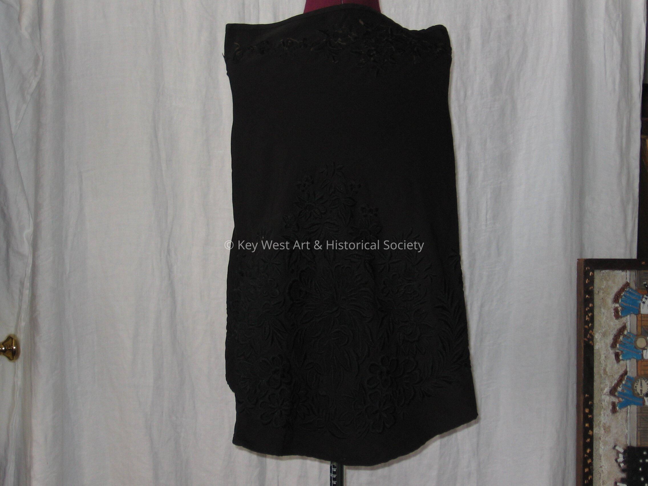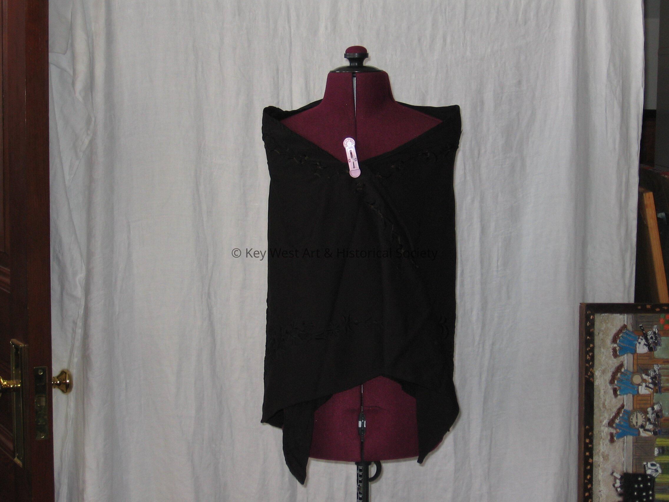 Black shawl or wrap with an embroidered floral and leaf pattern on the back.