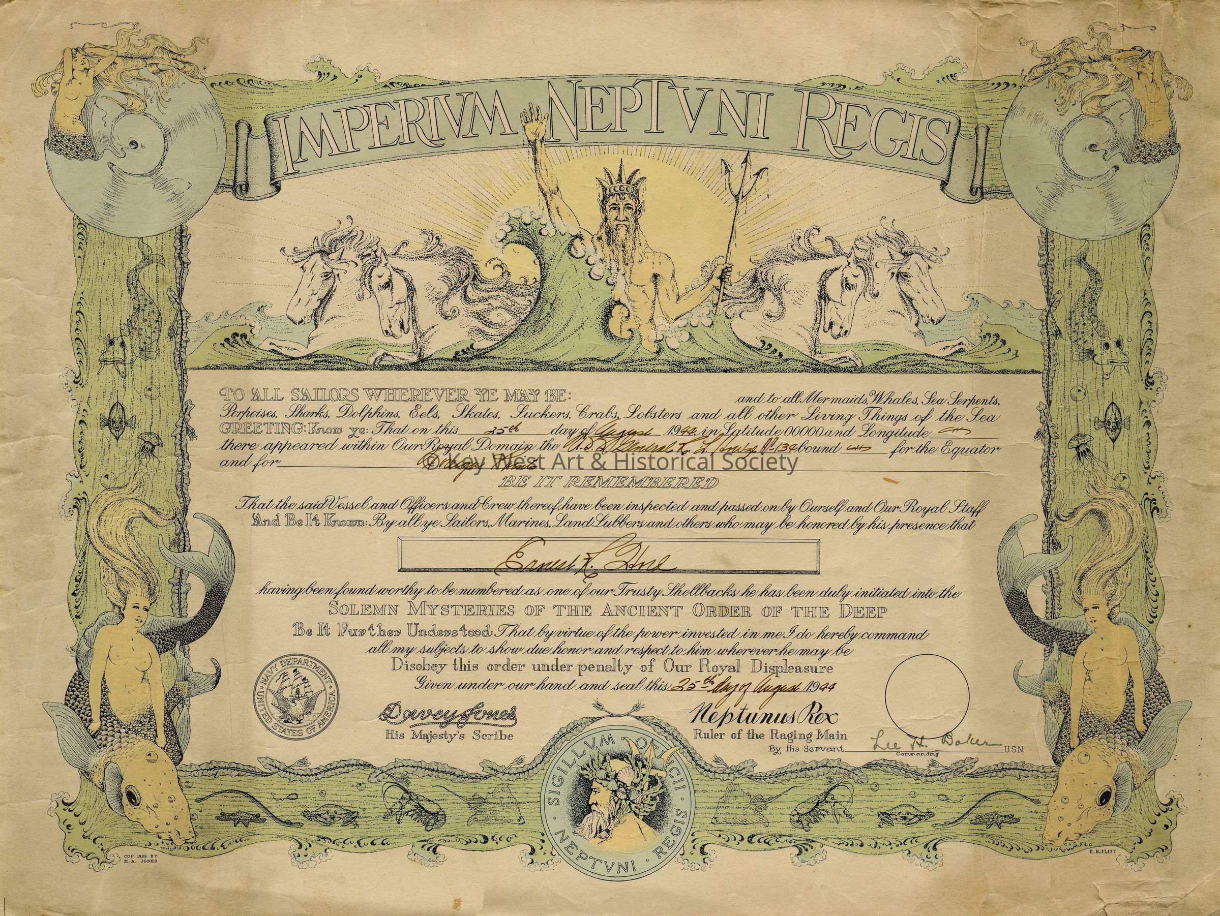 Shellback Certificate issued to Ernest K. Hord for crossing the equator onboard USS GENERAL R.L. HOWZE Howze (AP-134) during World War II.