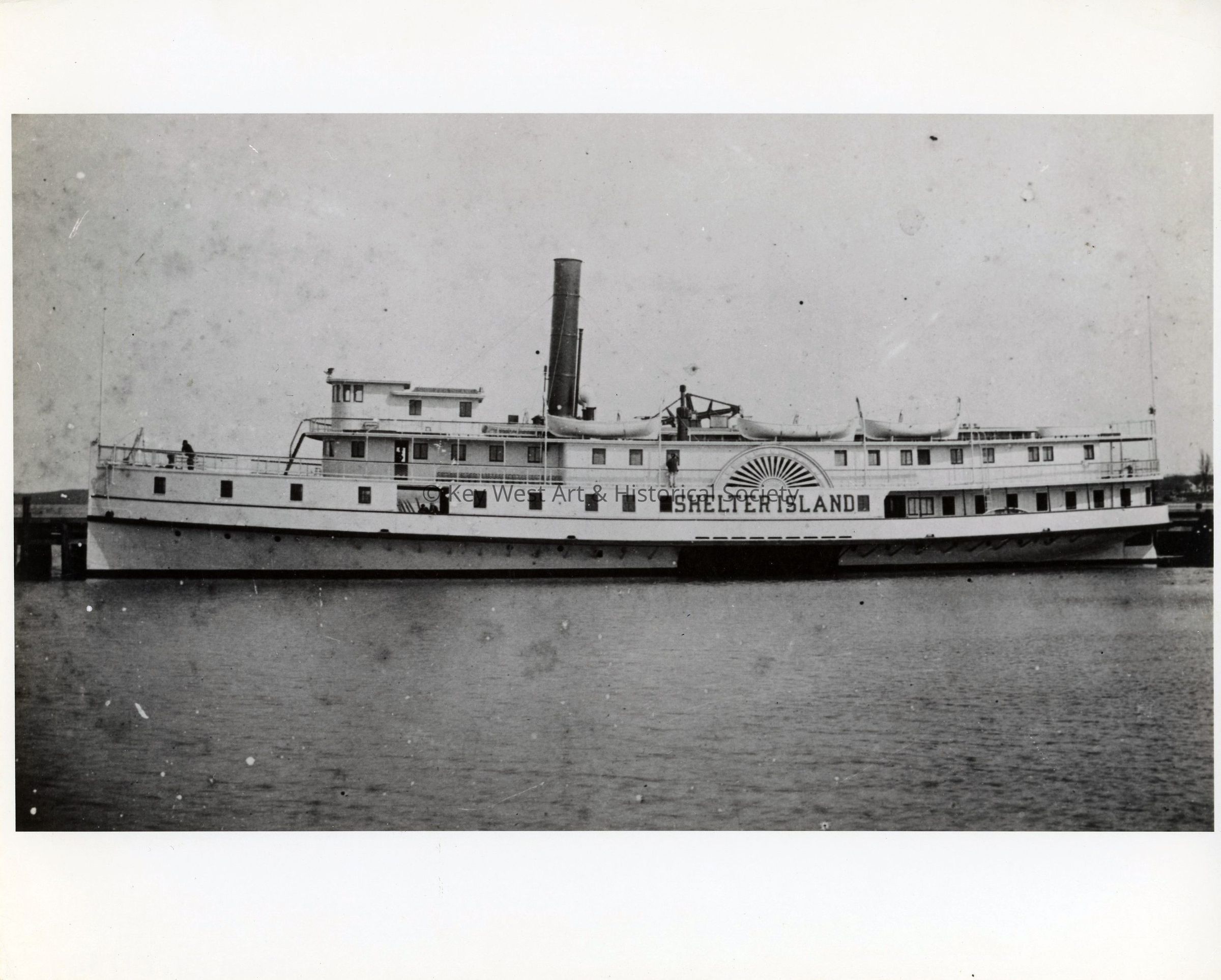 Black and white photograph of the Shelter Island side wheel paddle steamship that was used as a ferry between mainland Long Island and Shelter Island.