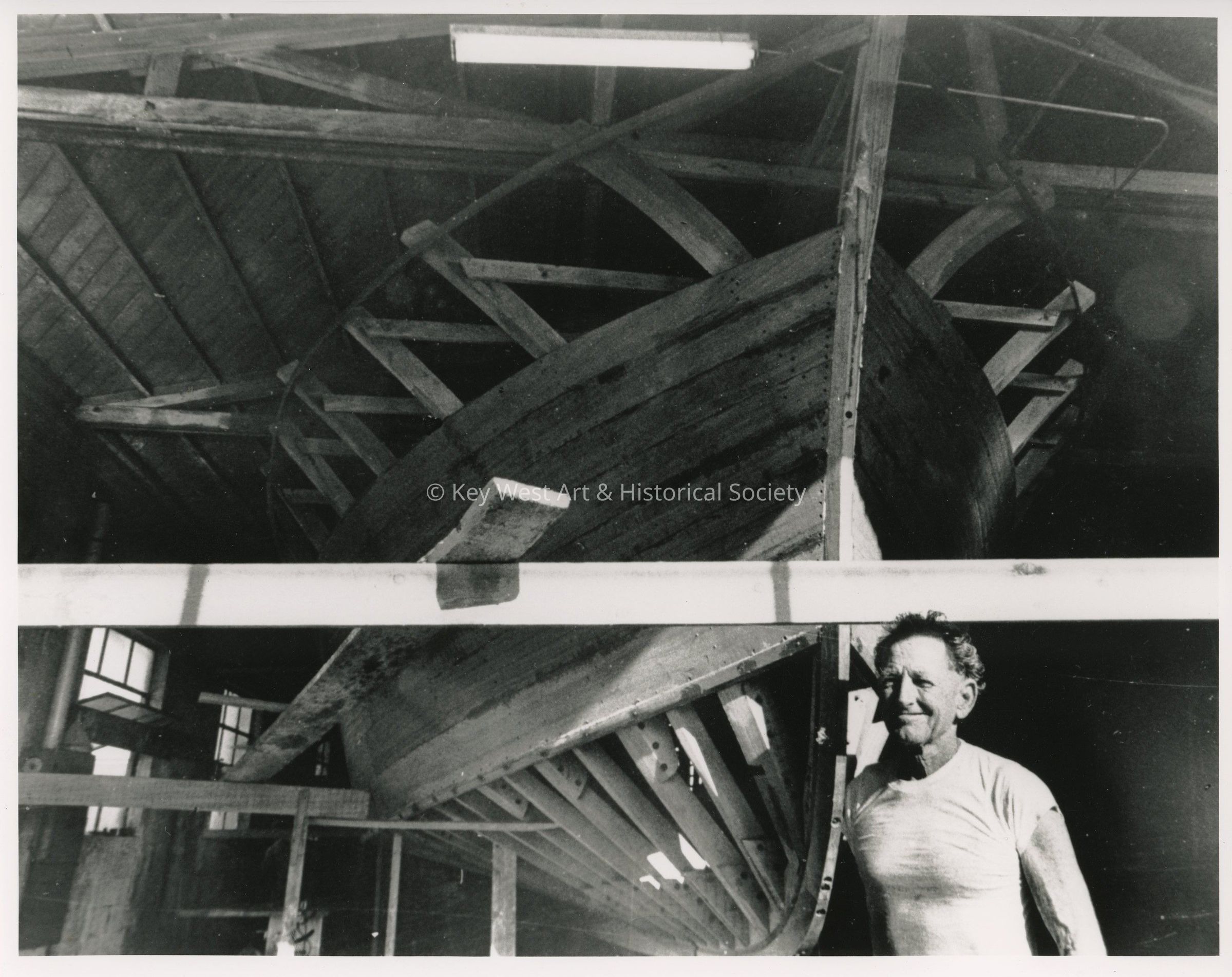 Black and white photograph of an unknown boat builder standing in front of an unfinished wooden vessel.