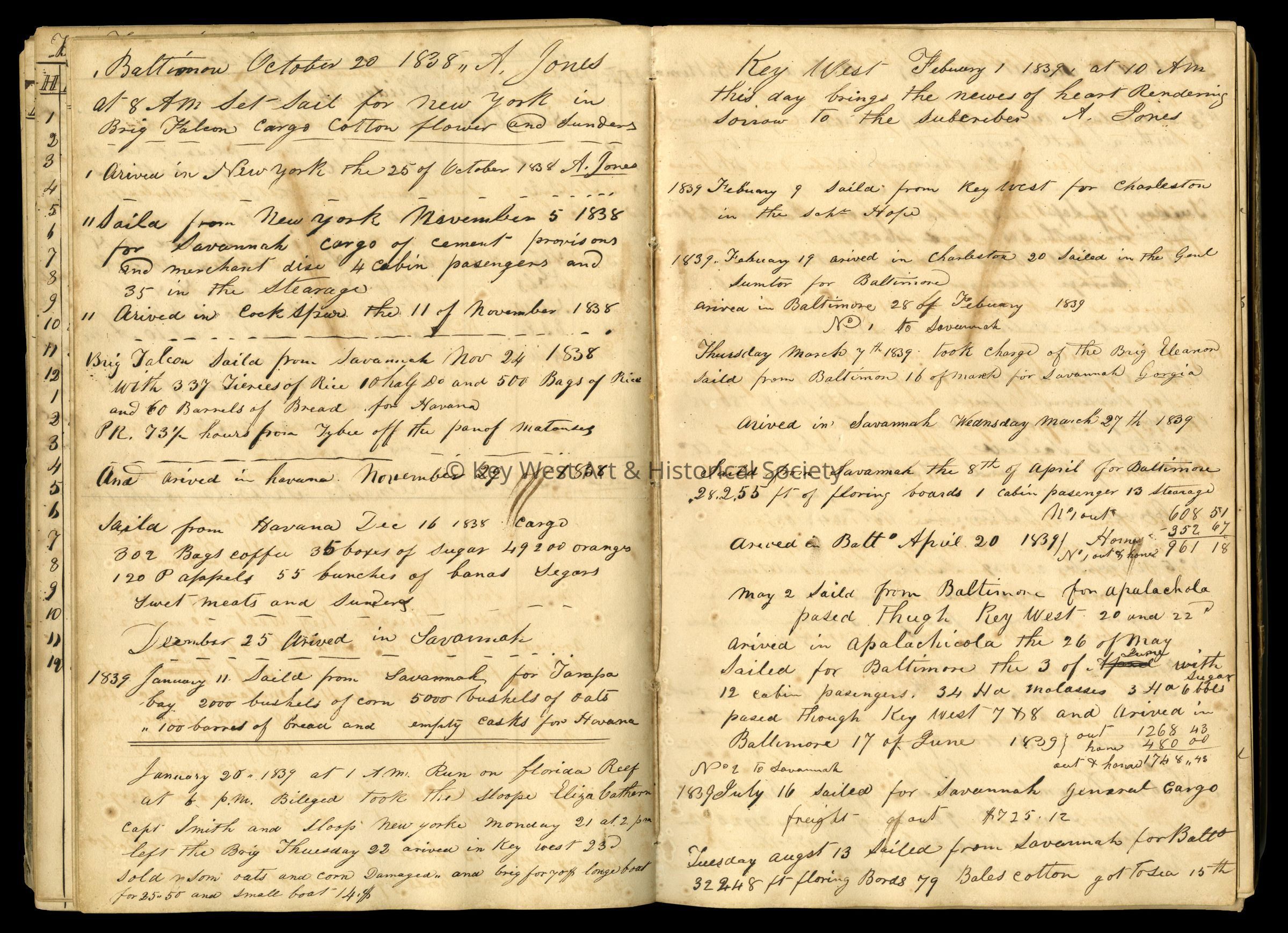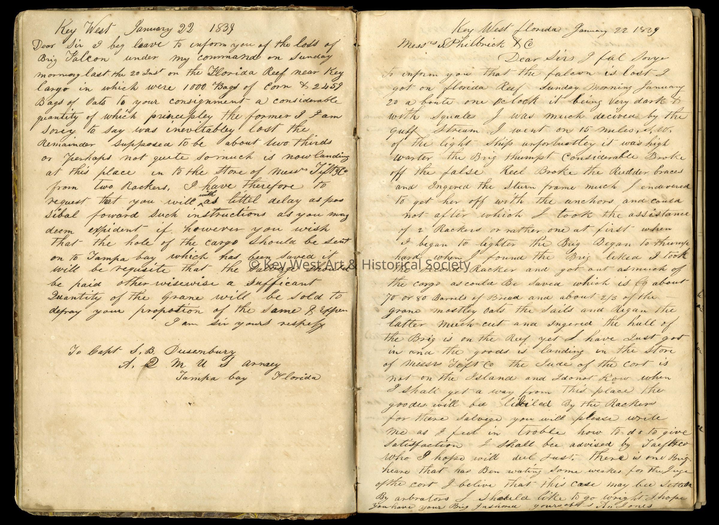 The journal begins with approximately 50 pages of navigational exercises and tables for determining position at sea, before beginning with the log of the Brig Falcon in February 1838. The log records position and weather on several voyages, between Philadelphia or Baltimore and Savannah. In January 1839, bearing a cargo of corn, oats and flour, the Falcon sets sail from Savannah for the Gulf coast of Florida. The journal entry for January 20, 1839 briefly records disaster: 'at 1am run on Florida Reef.' The loss of the Brig is described in more detail in the rear of the log, which Captain Jones used as a letterbook, transcribing over 100 letters written by him between 1839 and 1858. In a letter written from Key West on January 22, he describes running around, the irreparable damage to the ship and his attempts to recover the cargo.