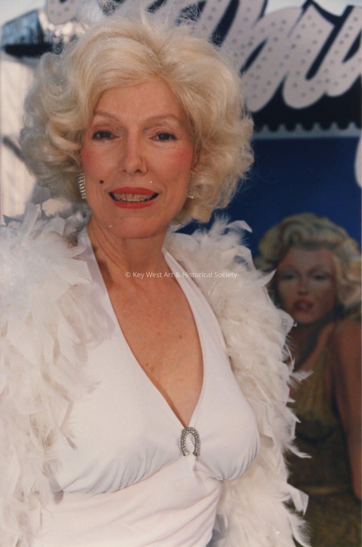 Color photograph of Shirley Freeman dressed up as Marilyn Monroe on a float.Collection