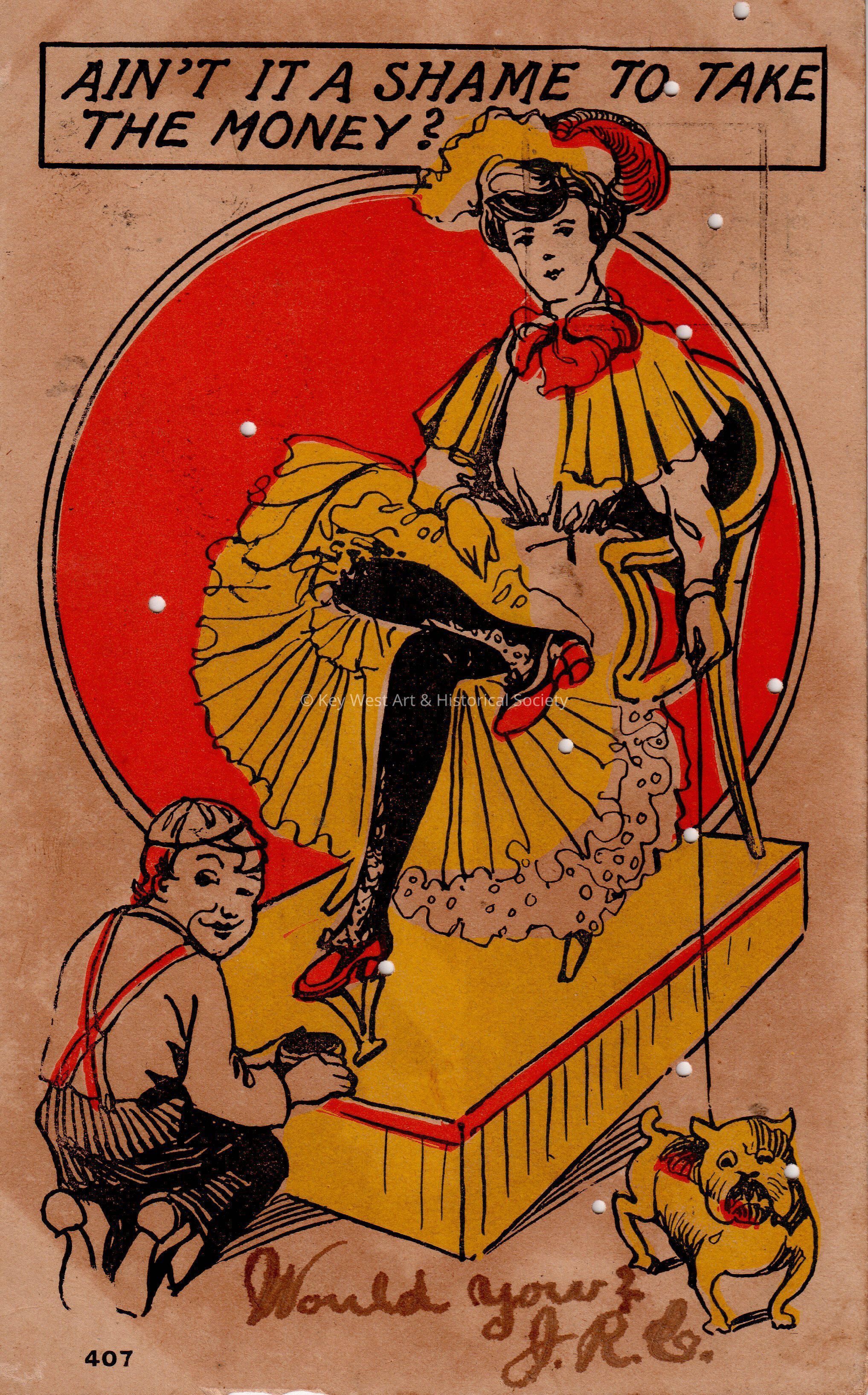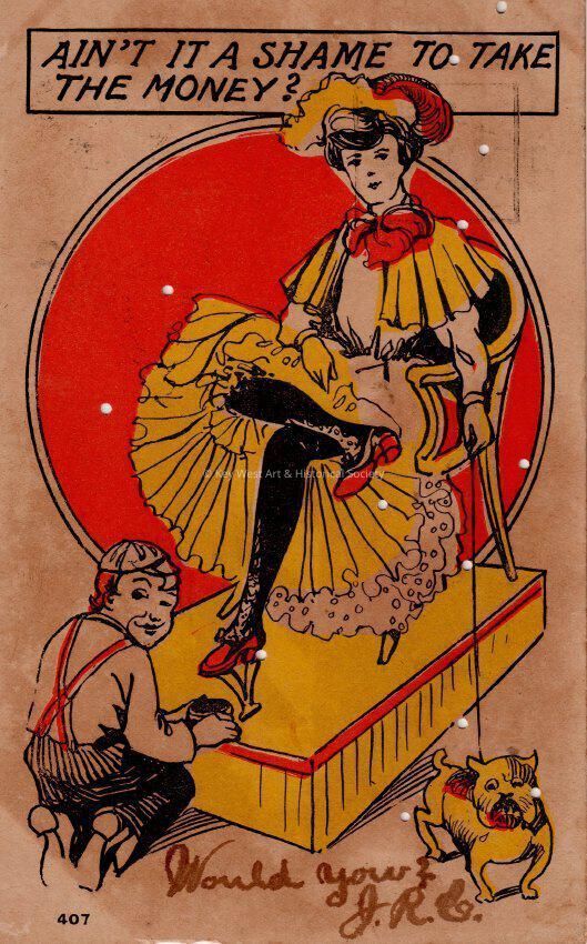 Postcard depicting a cartoon of a shoeshine boy polishing a woman’s shoes. The caption reads, ‘Ain’t it a shame to take the money?’ The message on the front reads, ‘Would You?, J. R. C.’ The card is addressed to Mr. John W. Hattrick, 2012 Latona Street, Southwest Station, Philadelphia, Pennsylvania.Collection