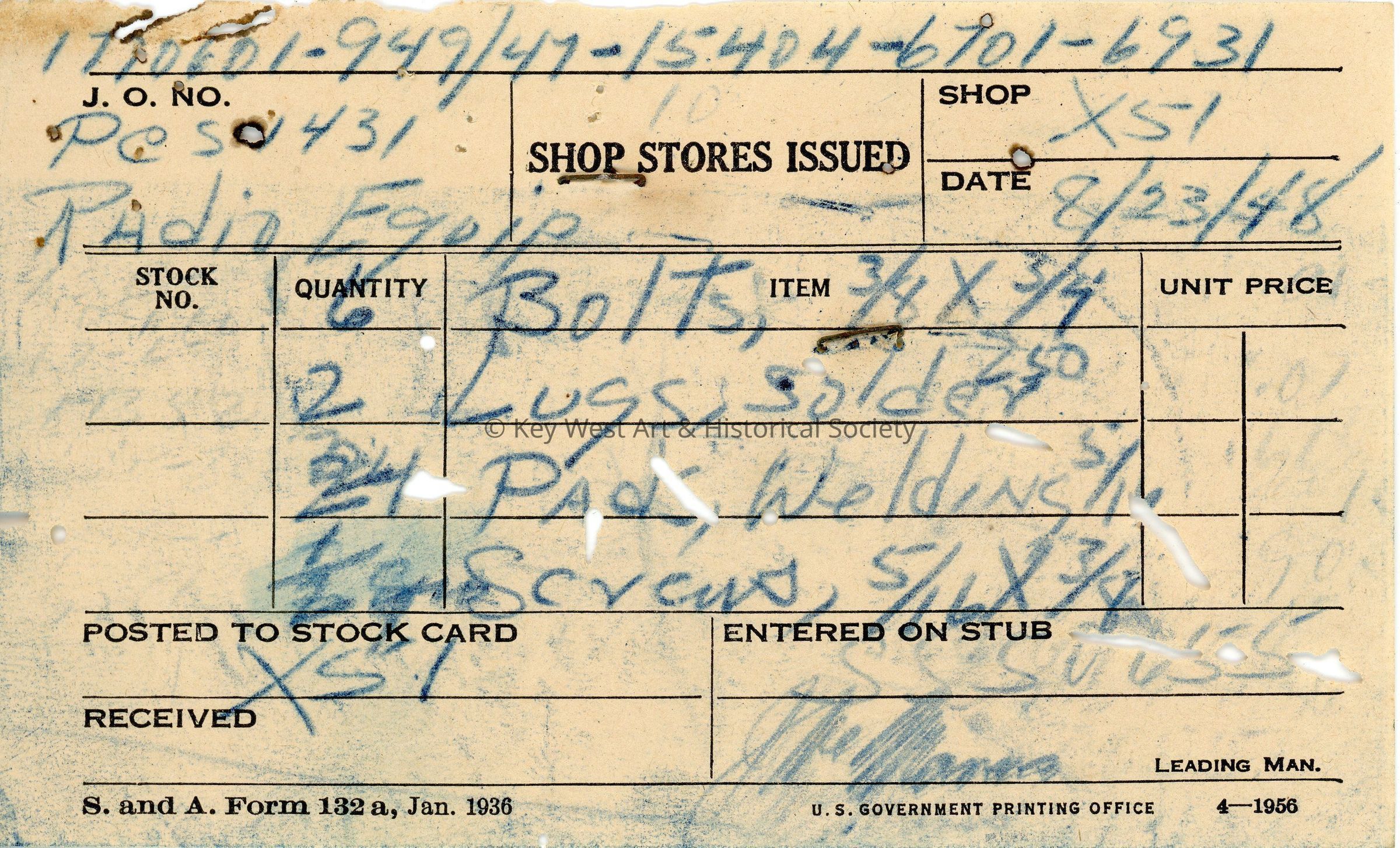 Form acknowledging the issuance of bolts, solder lugs, screws, and welding pads to be used in the installation of radio equipment on the USS EPCS-1431 stationed at Naval Station Key West.Collection