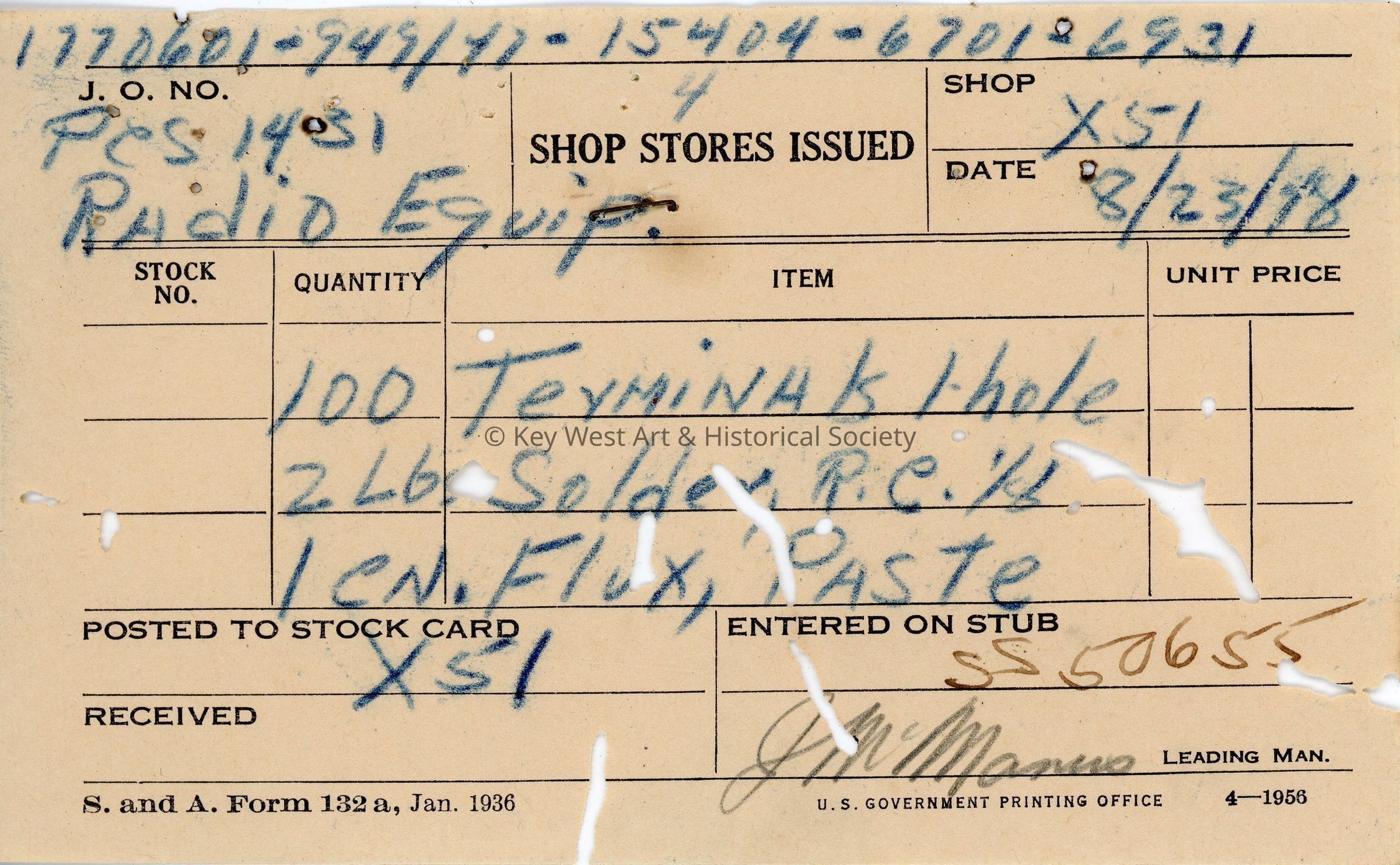 Form acknowledging the issuance of terminals, solder, and flux paste to be used in the installation of radio equipment on the USS EPCS-1431 stationed at Naval Station Key West.Collection