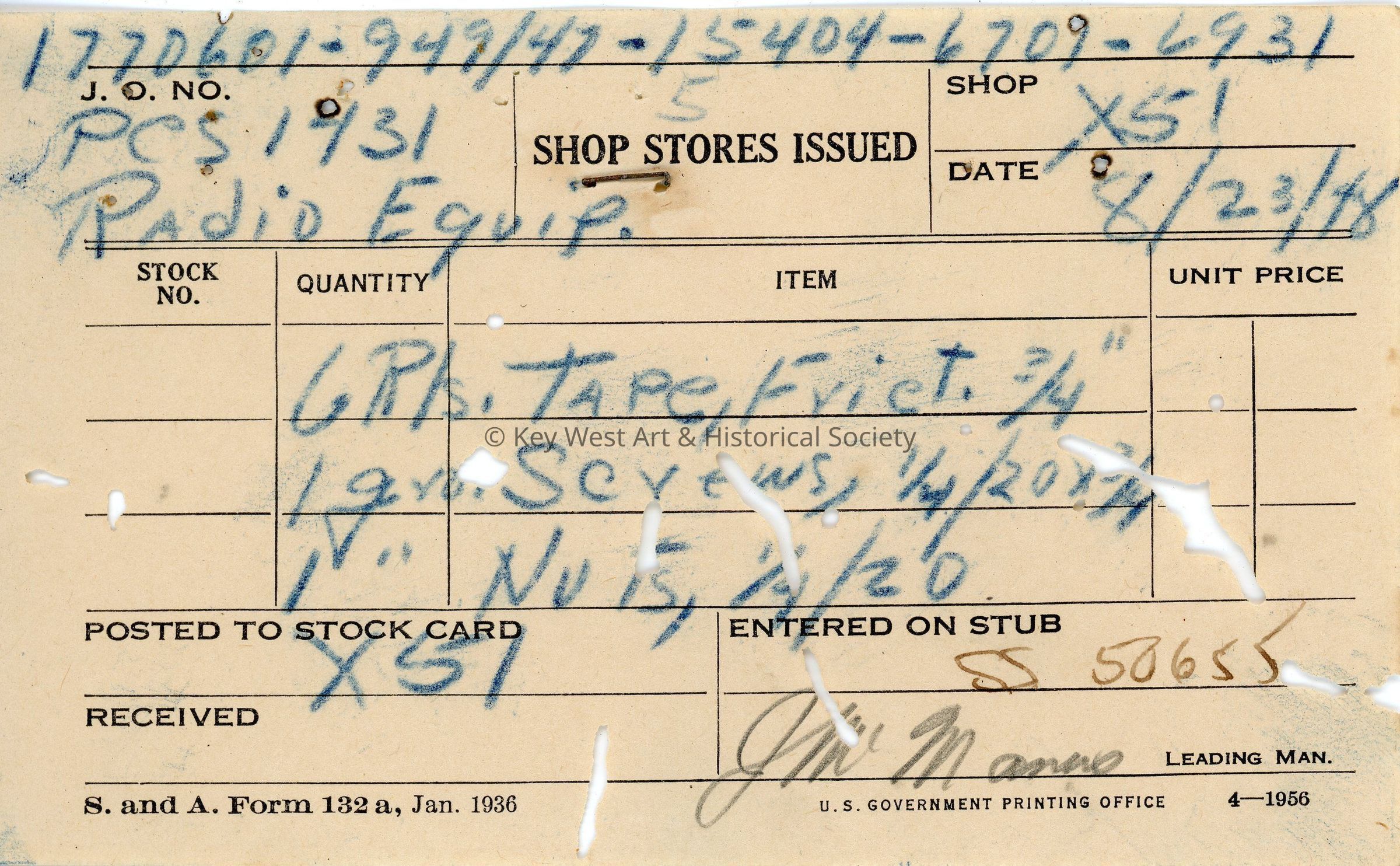 Form acknowledging the issuance of tape, screws, and nuts to be used in the installation of radio equipment on the USS EPCS-1431 stationed at Naval Station Key West.Collection