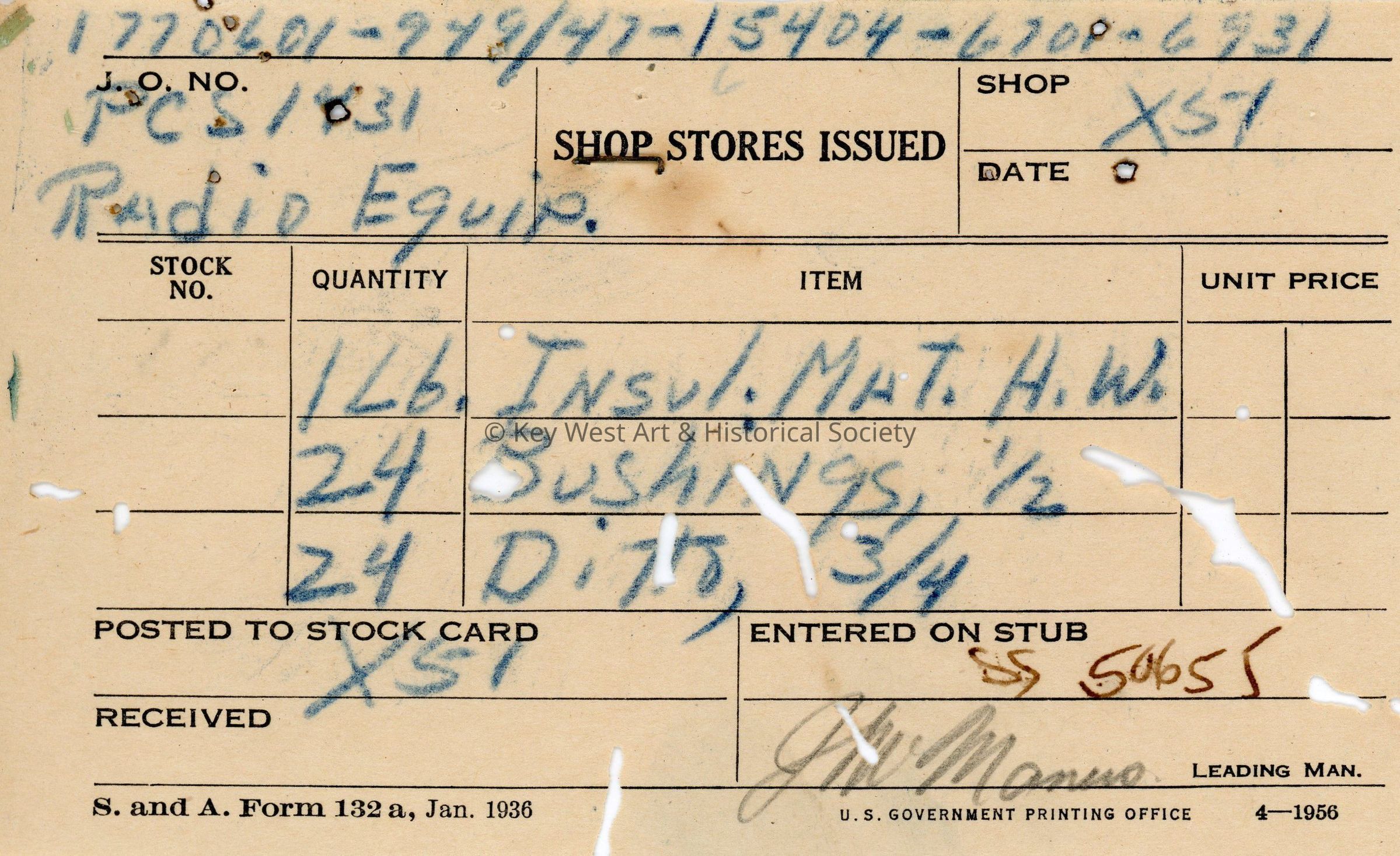 Form acknowledging the issuance of insulation material and bushings to be used in the installation of radio equipment on the USS EPCS-1431 stationed at Naval Station Key West.