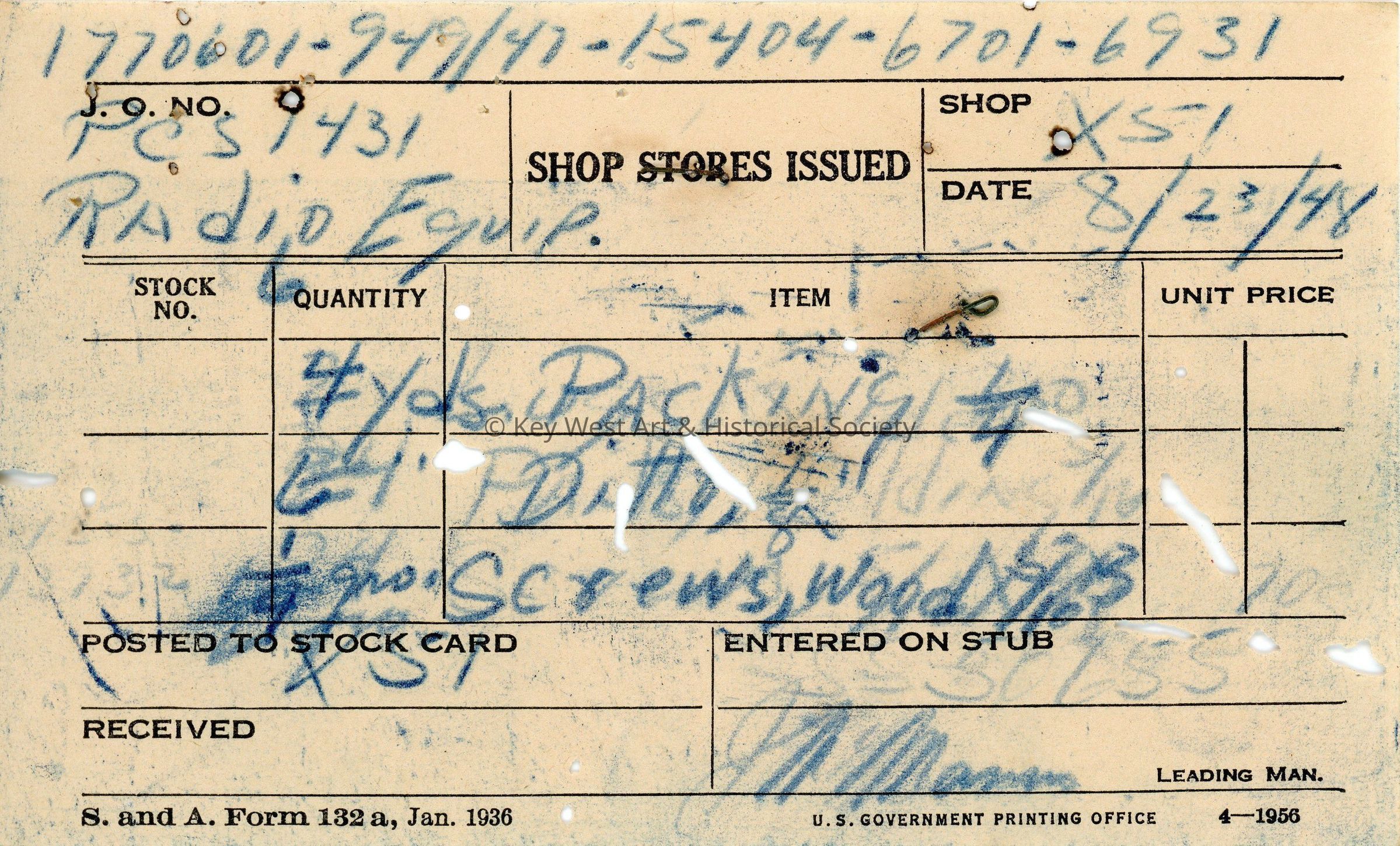 Form acknowledging the issuance of packing material and wood screws to be used in the installation of radio equipment on the USS EPCS-1431 stationed at Naval Station Key West.