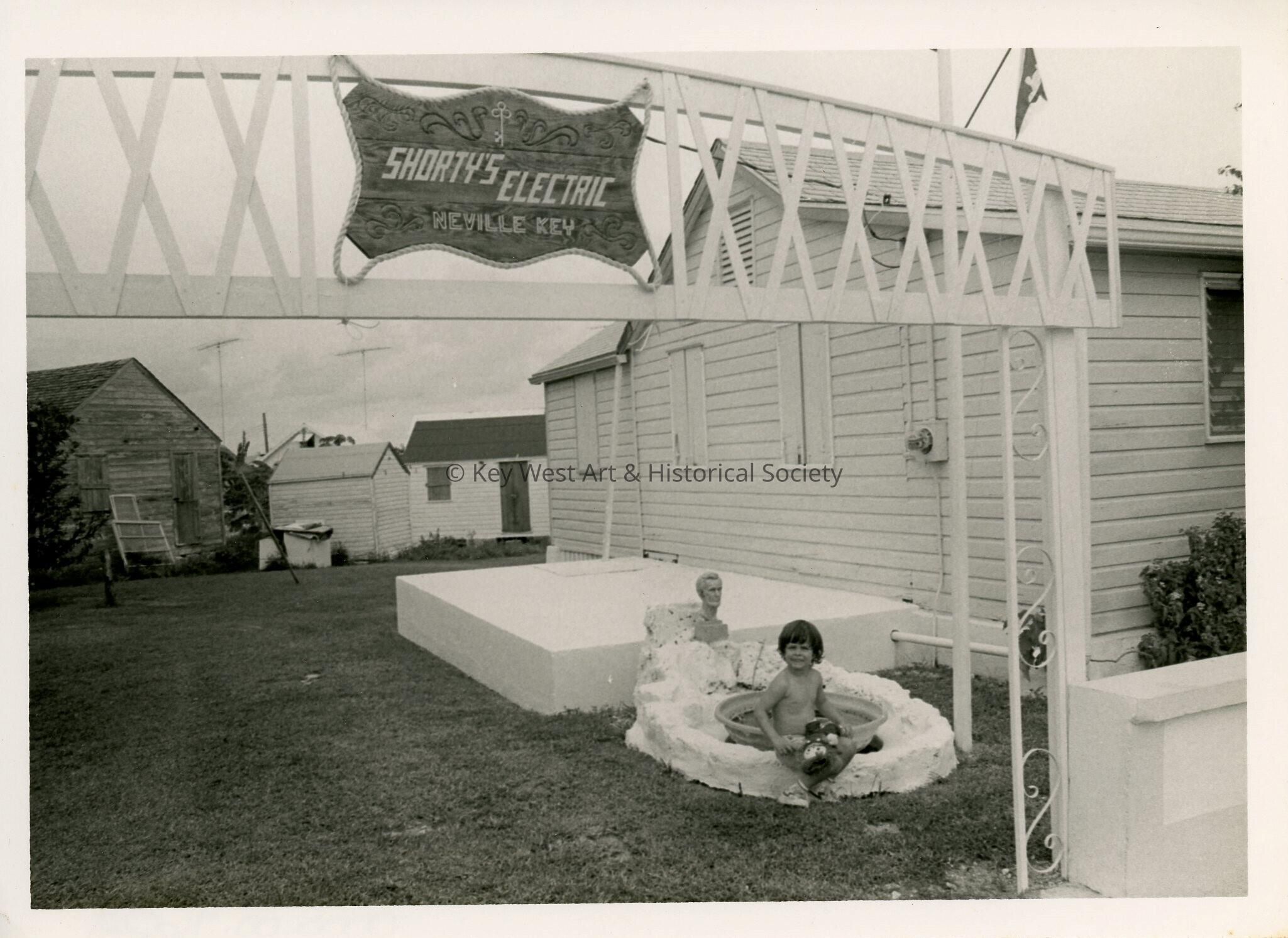 Black and white photograph of an unknown child playing beneath a sign that reads, 'Shorty's Electric Neville Key'.