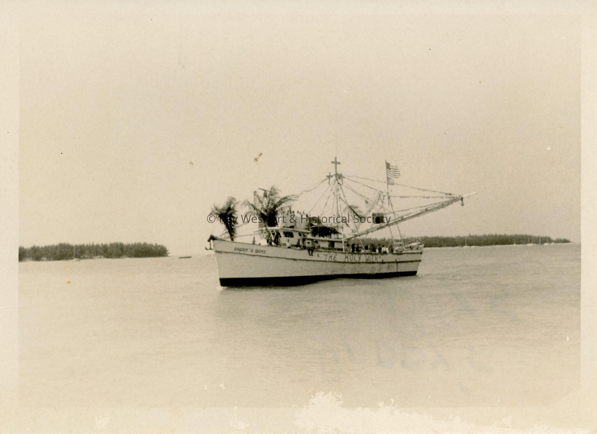 Black and white photograph of the shrimp boat 'Daddy's Boys' taken during the Blessing of the Fleet.Photograph Details