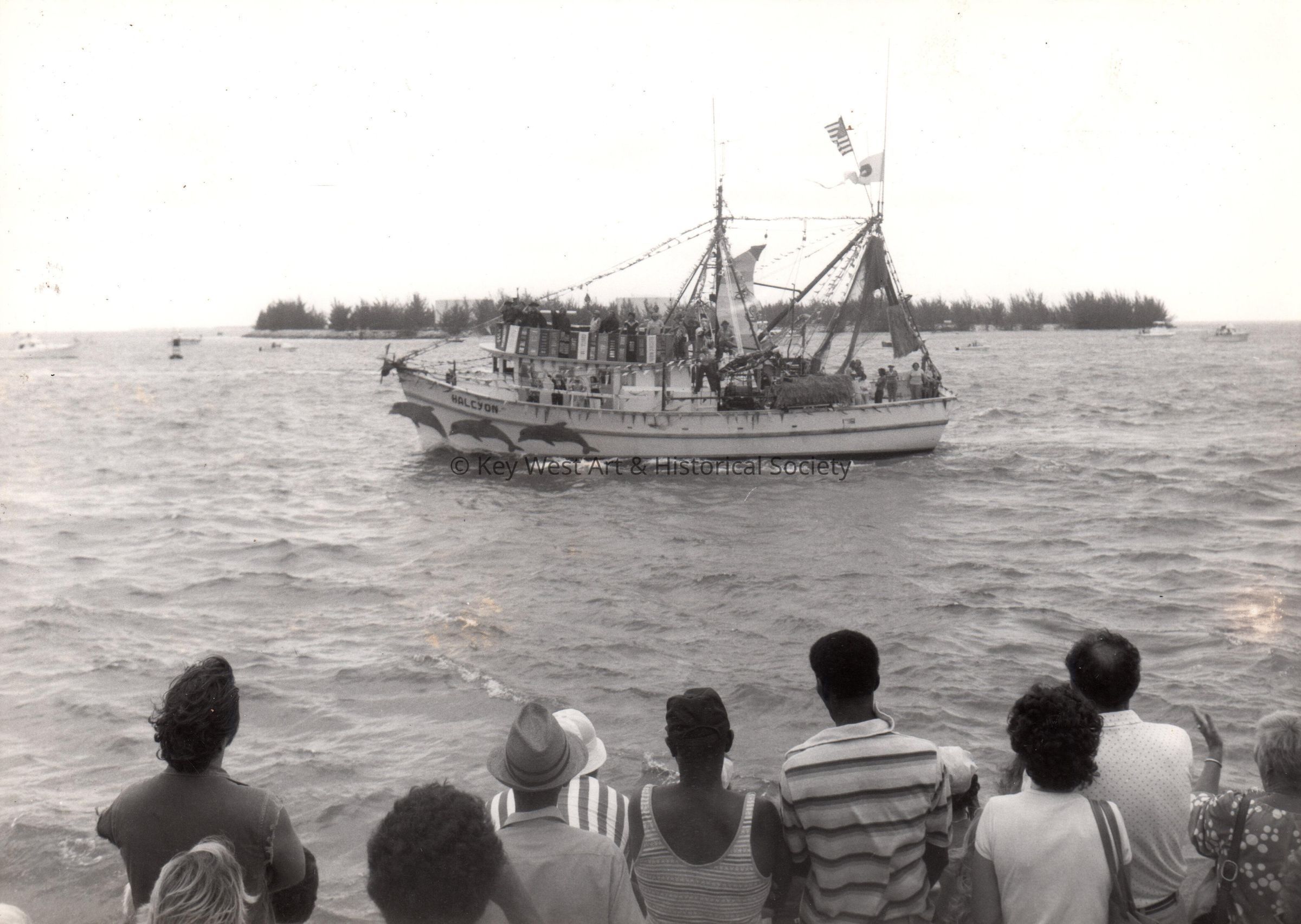 Black and white photograph of the shrimp boat HALCYON at the Blessing of the Fleet. Wisteria Island visible in the background.