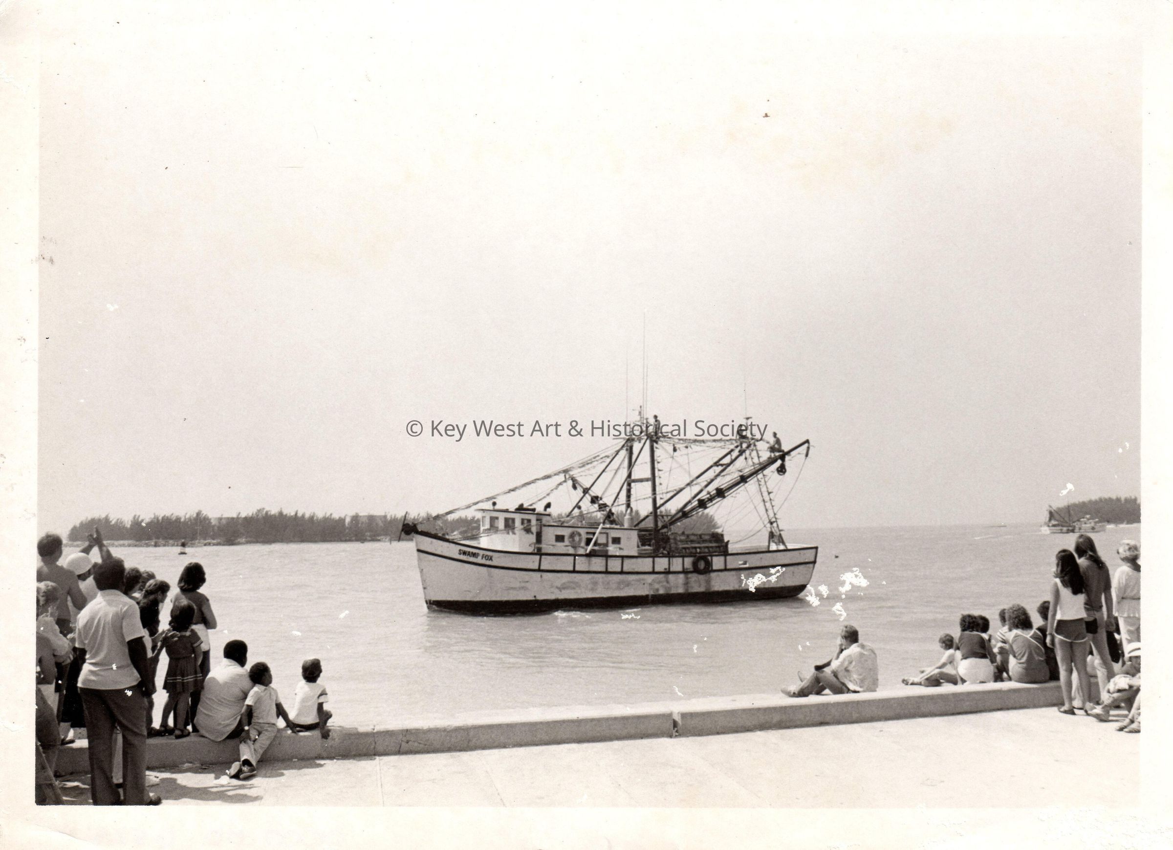 Black and white photograph of the shrimp boat SWAMP FOX during the Blessing of the Fleet off Mallory Square.