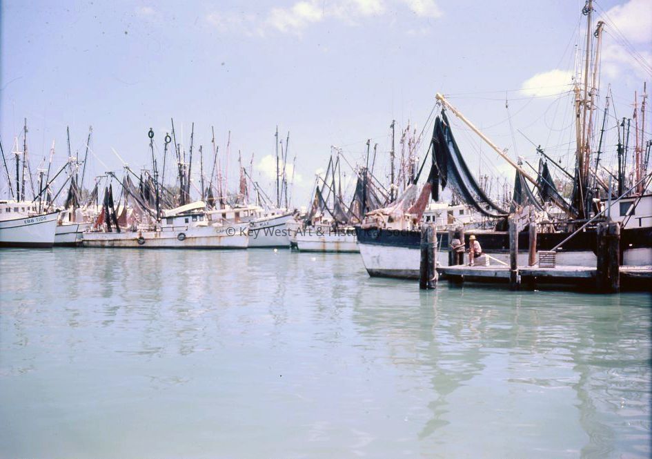 Color photographic negative depicting several shrimp boats in Key West Bight.