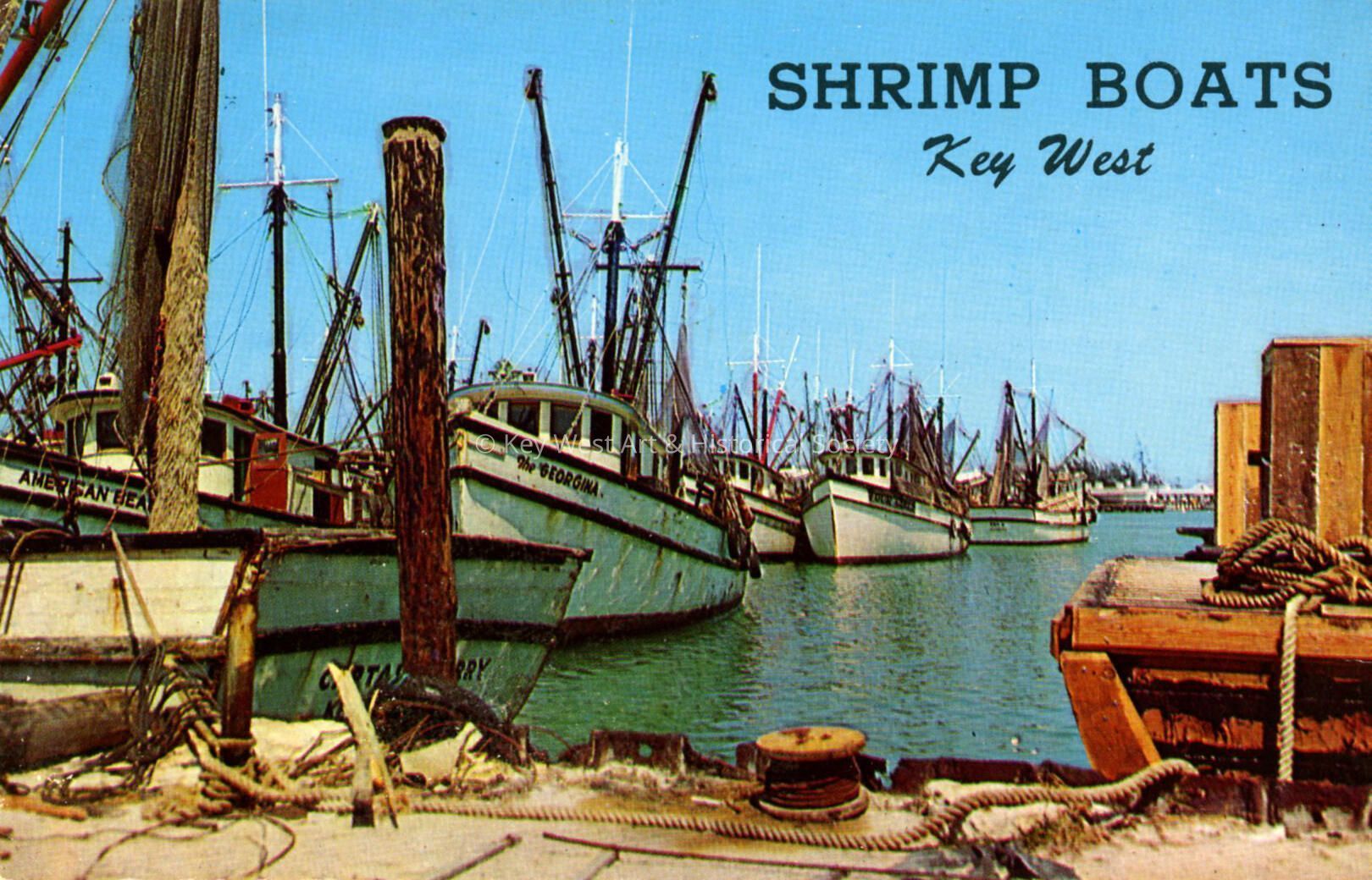 Postcard depicting shrimp boats docked in Key West Bight. Notation on verso, 'Shrimp boats snuggling in the Harbour at Key West, Florida.'Subject Place