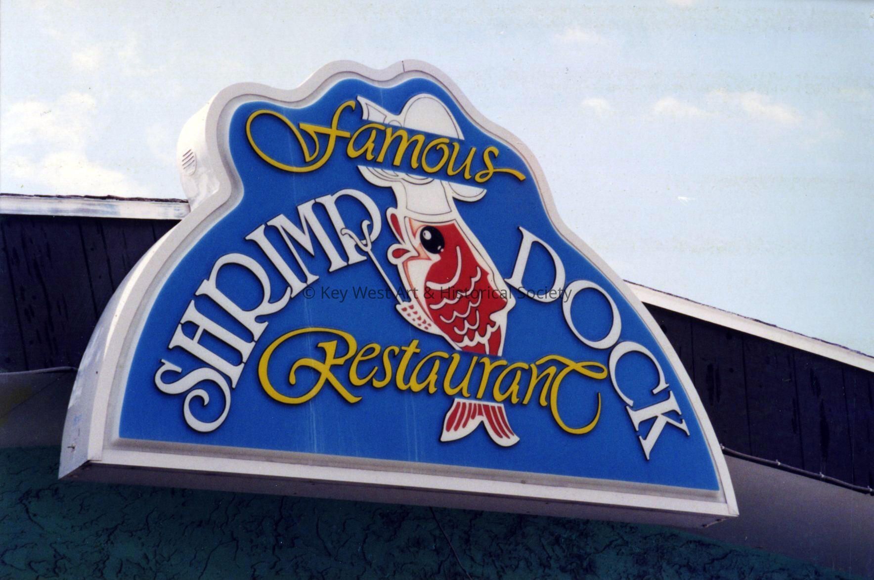 Color photograph taken by historian James M. Goode of the Shrimp Dock Restaurant sign at 2210 North Roosevelt Boulevard during a trip to Key West in August 2001. Printed from Roll 15.