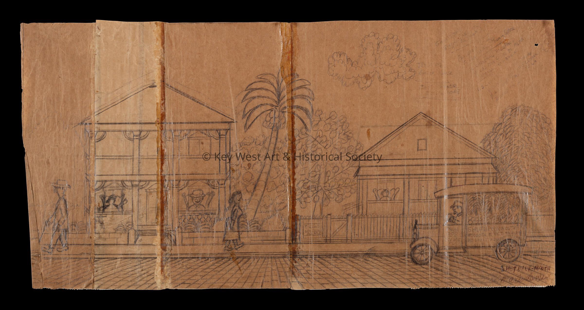 Pencil sketch on an unfolded paper bag by Mario Sanchez depicting the Shut Up Yur Mouth Froots & Vegitables [sic] vendor in his cart.Type of Drawing