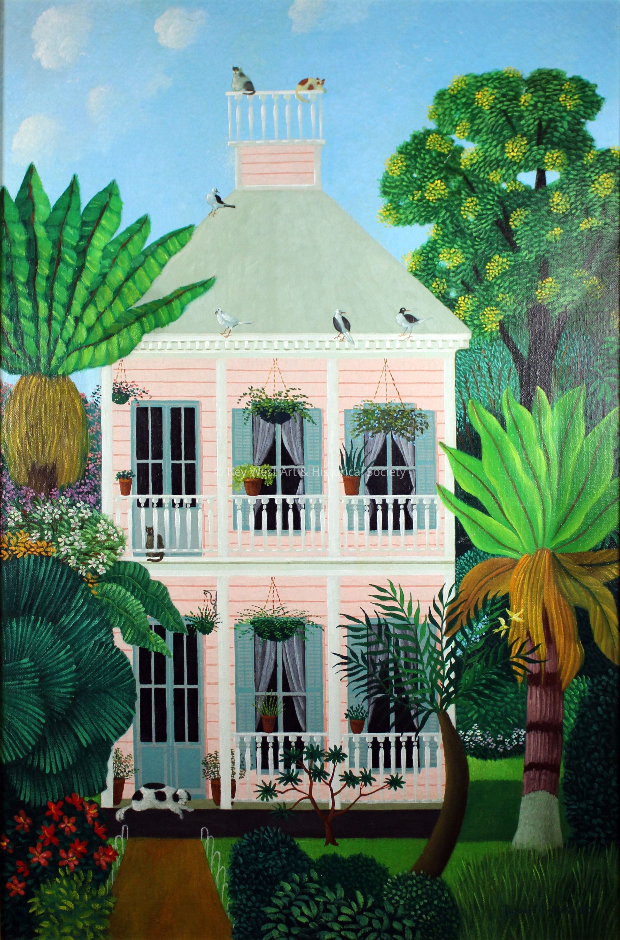 In the image, there is a charming two-story pink house adorned with blue shutters and surrounded by lush greenery, including large palm leaves, flowering plants, and tall trees. The house features a rooftop with a balustrade where a cat is lounging, and various birds are perched, enjoying the sunny sky with soft, fluffy clouds. Hanging planters with cascading plants decorate the upper balcony, while potted plants add a touch of nature to the lower level. Curtains can be seen through the windows, and a path leads to the entrance where a spotted dog rests contentedly amidst the vibrant, well-tended garden.