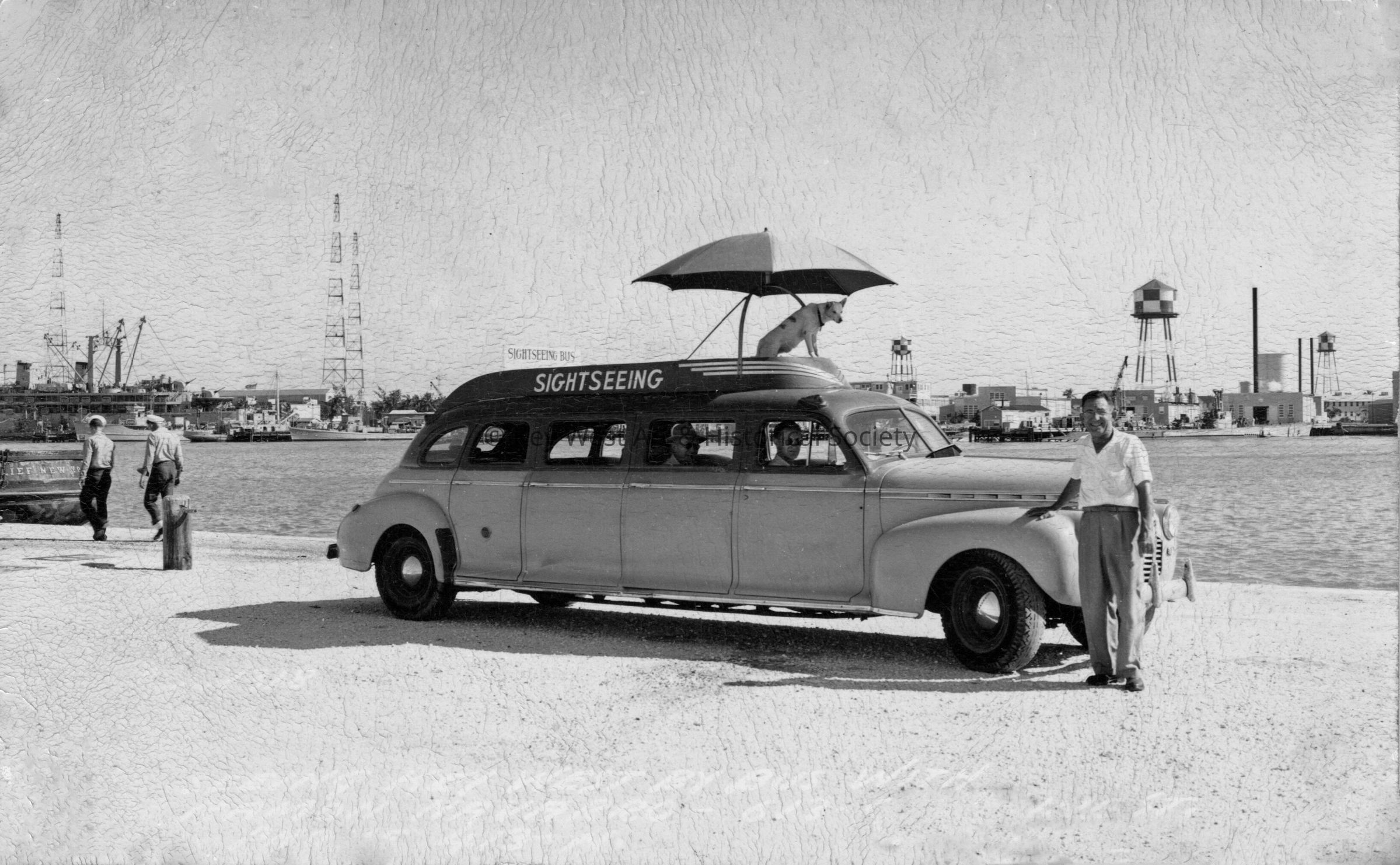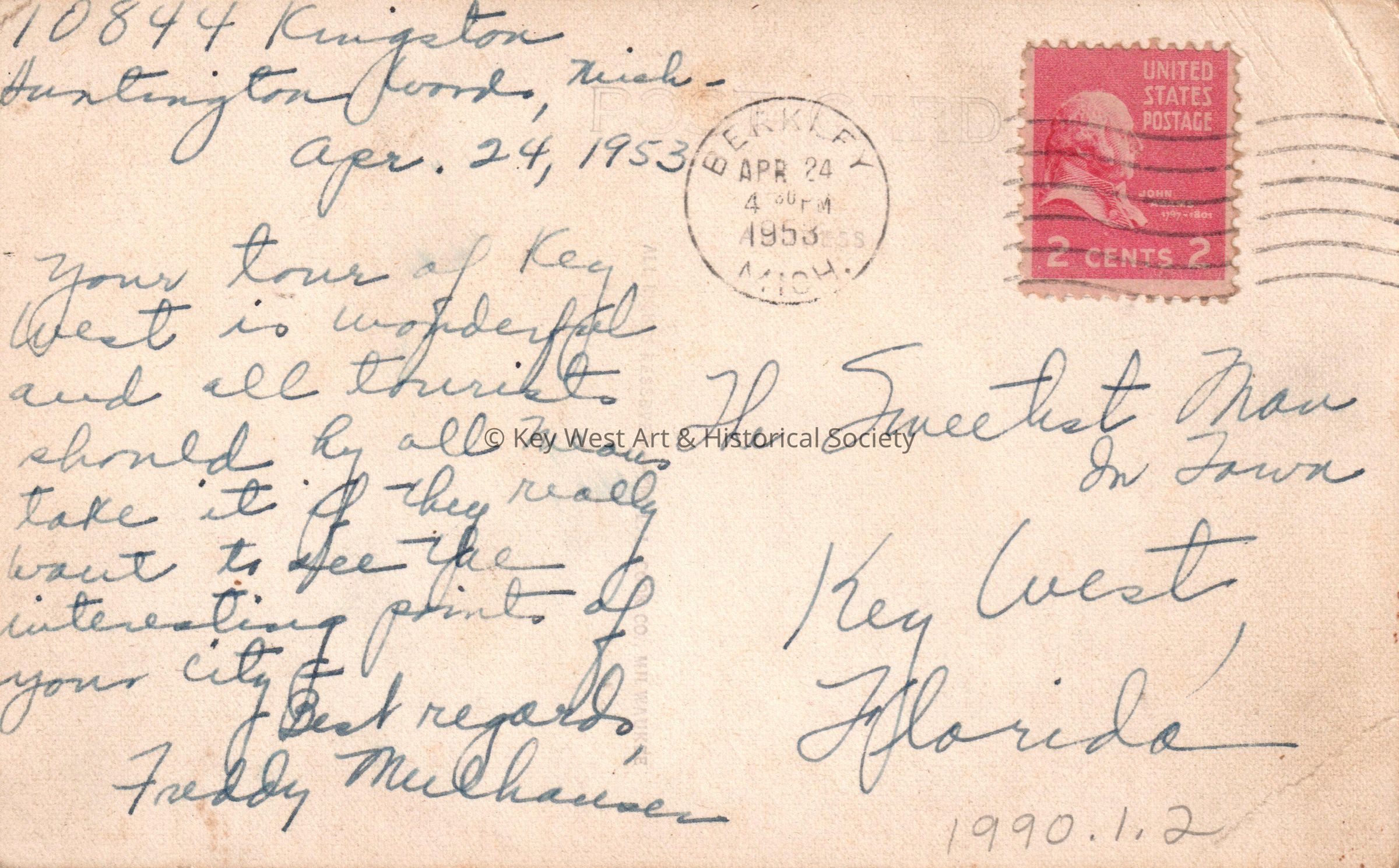 Postcard depicting a sightseeing car with a dog sitting upon the roof of the car beneath an umbrella. A man is standing at the front of the car and passengers are inside. The car is parked on a dock or pier. The caption reads, ‘Seeing Key West by Bus with Ramon Navarro – 613 Caroline Street, Phone 413 N’. The message on the verso reads, ‘10844 Kingston, Huntington Woods, Michigan, April 24, 1953, your tour of Key West is wonderful and all tourists should by all means take it if they really want to see the interesting points of your city. Best Regards, Freddy Mulhauser’. The card is addressed to the Sweetest Man in Town, Key West, Florida, and is postmarked Berkley, Michigan, April 24, 1953.Subject Place