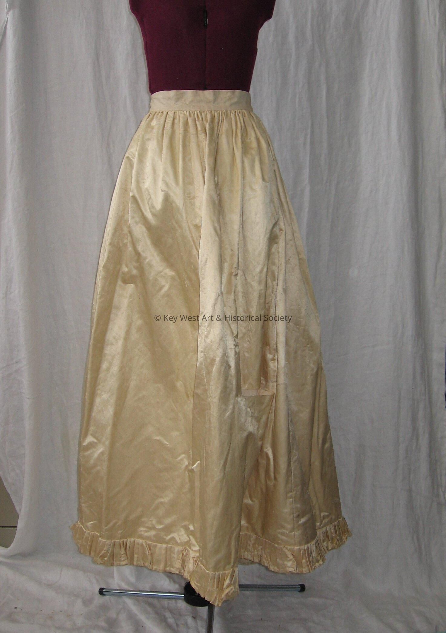 Full length skirt of white or ivory silk with pleated hemline. Material is tightly gathered to cotton waistband and lined with cotton.Collection