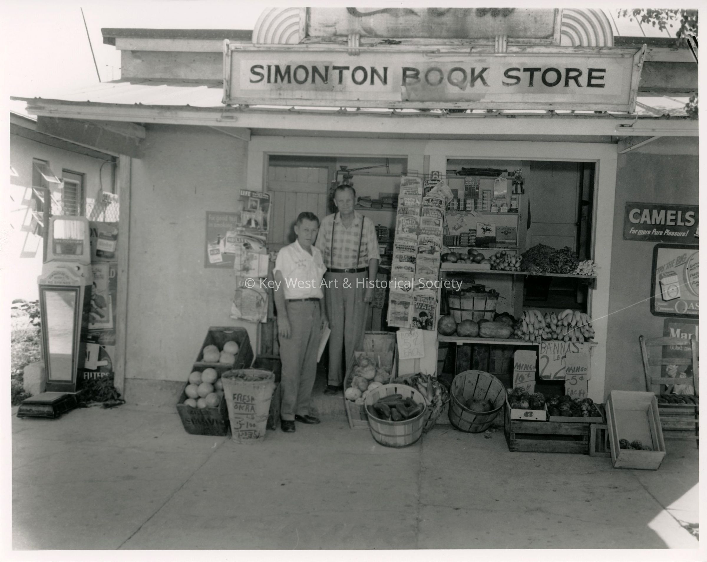 Black and white photograph of two men standing outside Simonton Book Store.