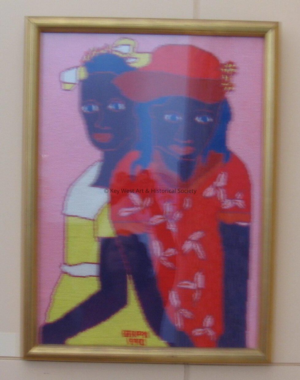 Needlepoint by Jack Baron depicting two girls sitting alongside one another. The girl on the left is wearing a yellow and white dress with a yellow hat. The girl on the right is wearing a red dress with pink leaves on it and a red hat.Artwork Details