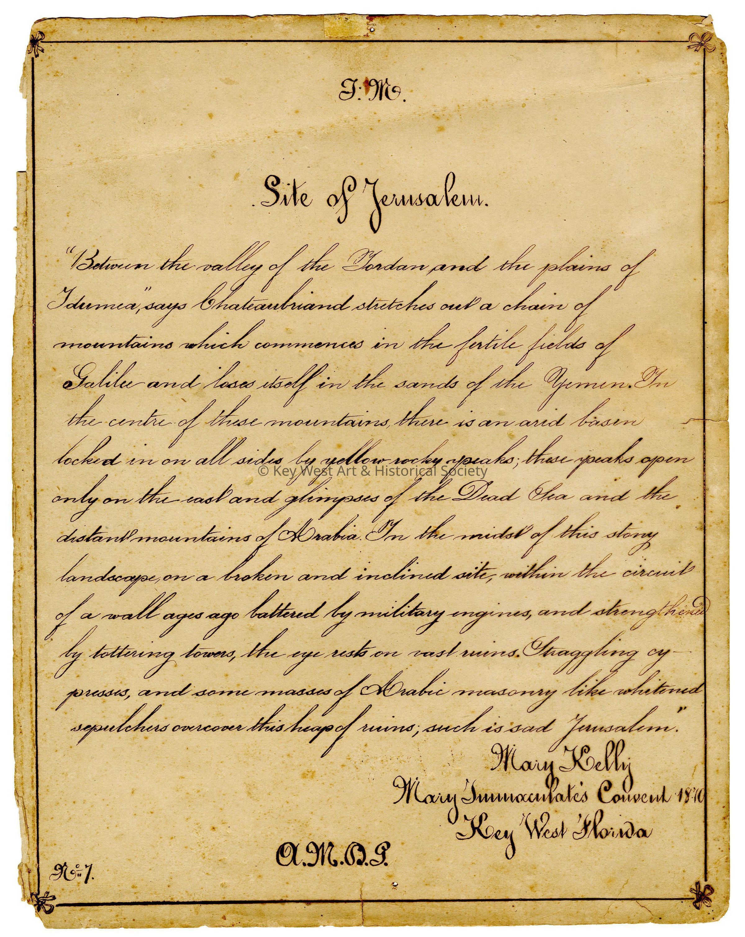 Handwritten poem titled 'Site of Jerusalem' that was written by Mary Kelly when she was a student at the Convent of Mary Immaculate. The paper's border has elaborately drawn flowers and scroll work.Collection