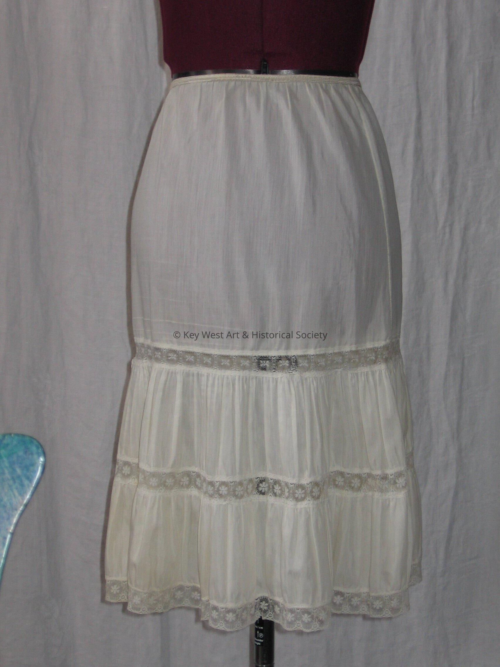 White Dacron nylon cotton slip with lace insets and an elastic waist. Made by Blue Swan.