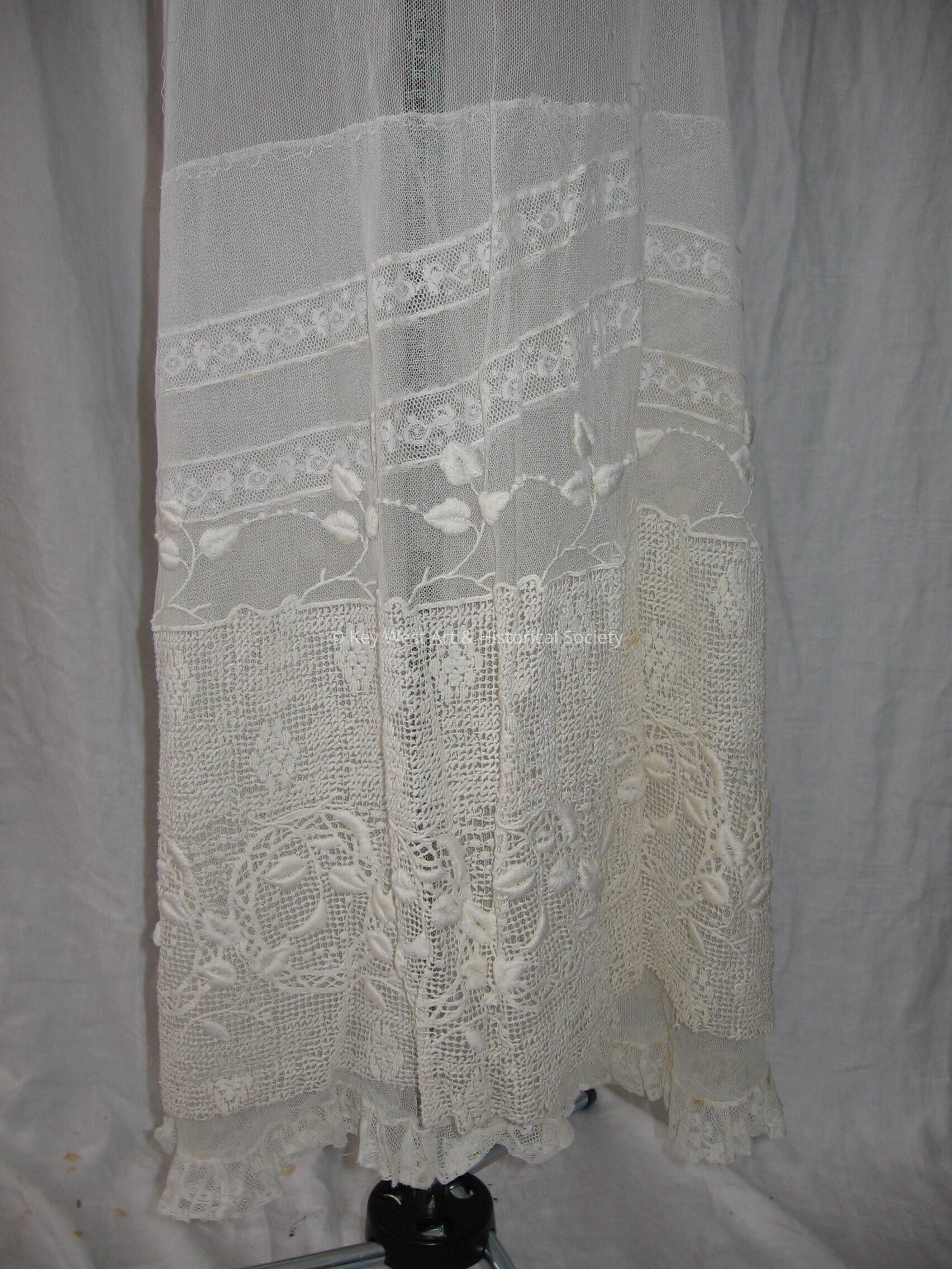 White lace skirt slip with embroidered bottom. Snap closure in back.