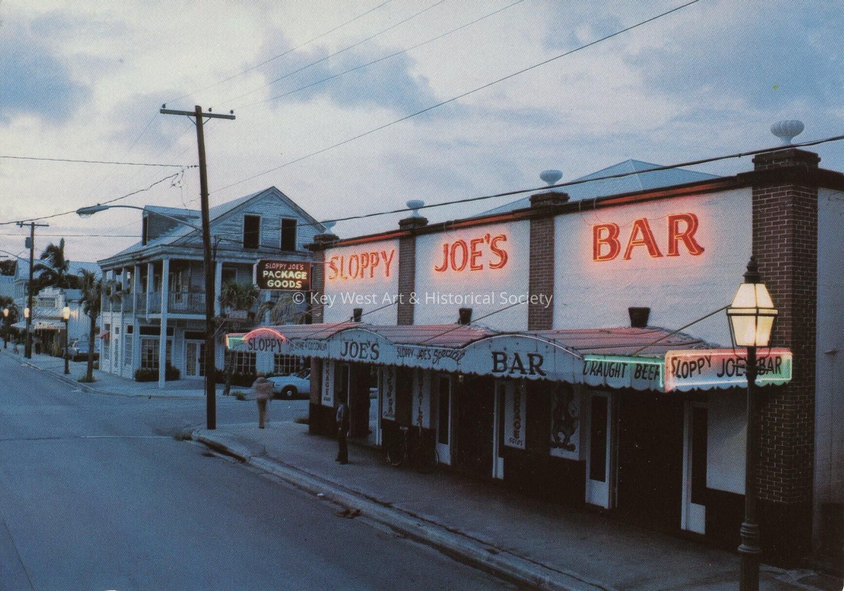 Postcard depicting Sloppy Joe's Bar. Description on verso reads, 'Sloppy Joes Bar - Very few visitors to Key West can resist at least a glimpse into this landmark - said to have been Ernest Hemingway's favorite.'Collection
